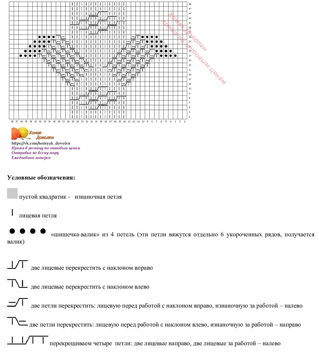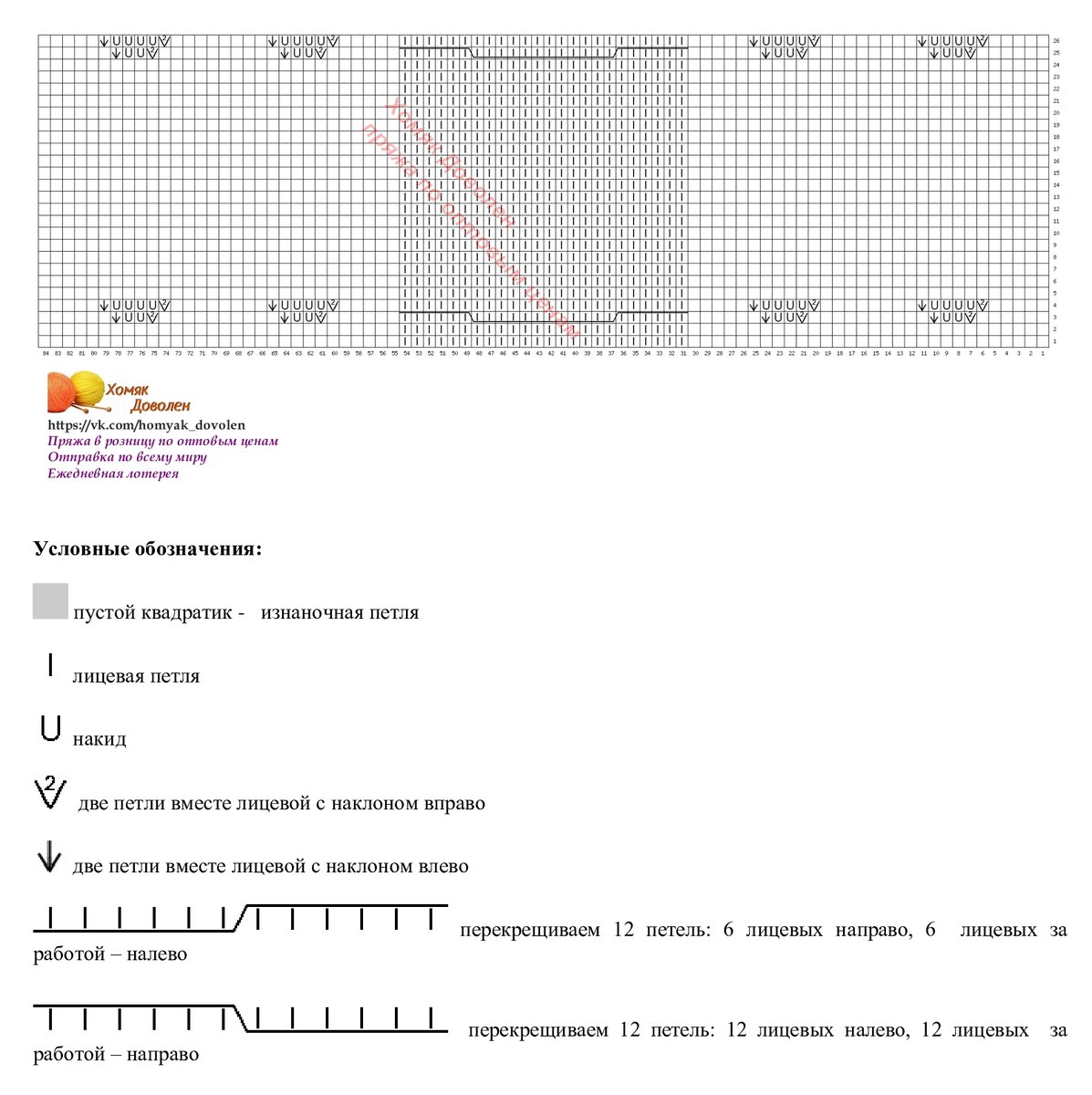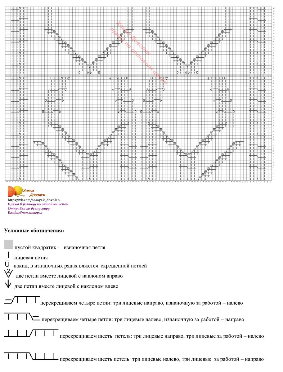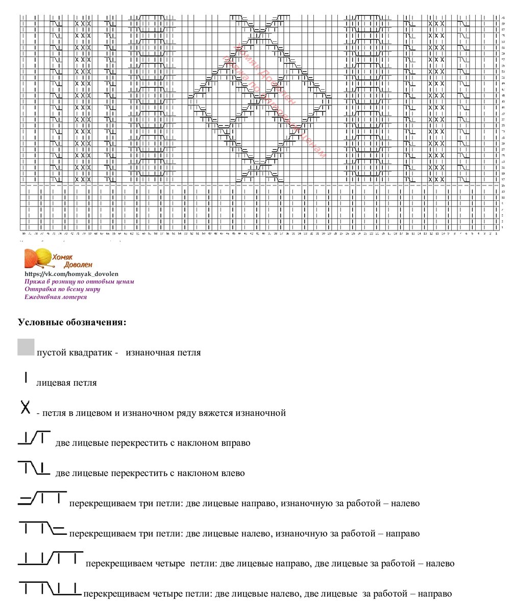 На этой схеме нарисован узор для центра безрукавки. По краям от него чередуются жгуты из двух петель и маленькие ромбики (на нужное количество петель).