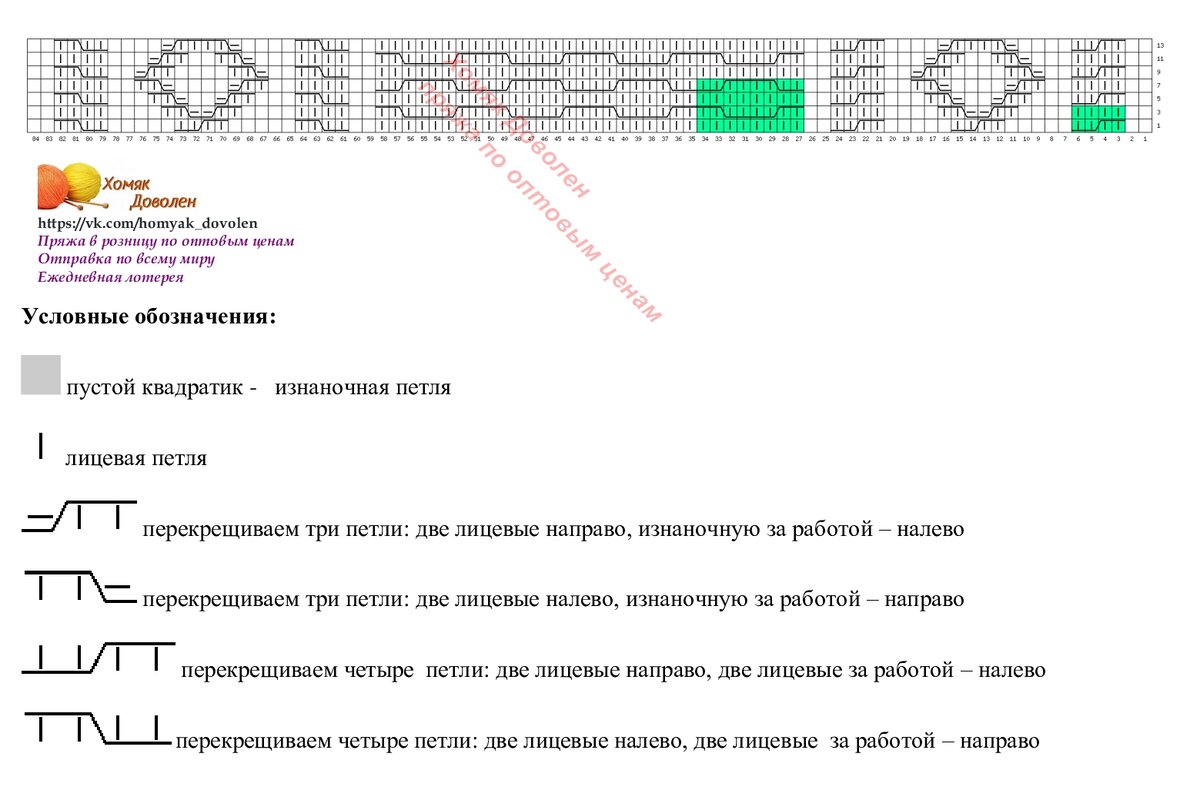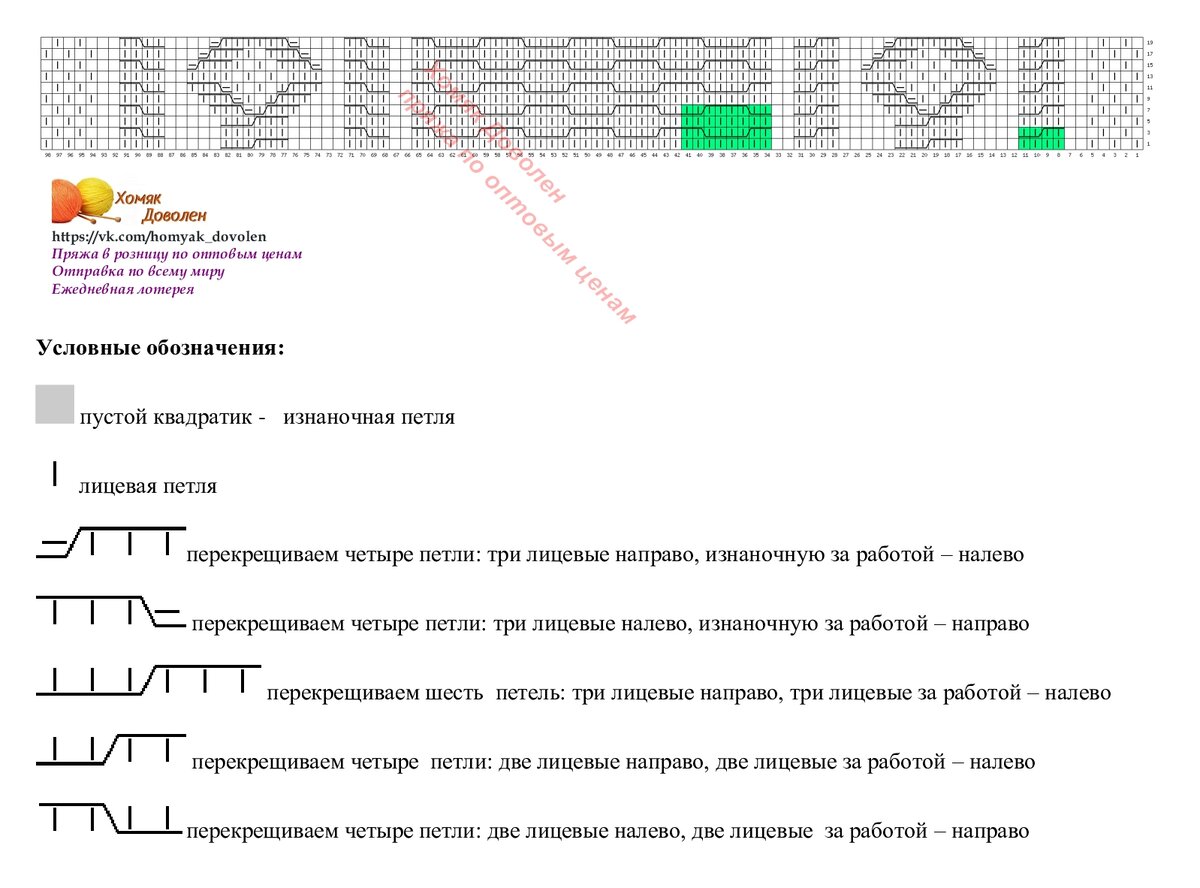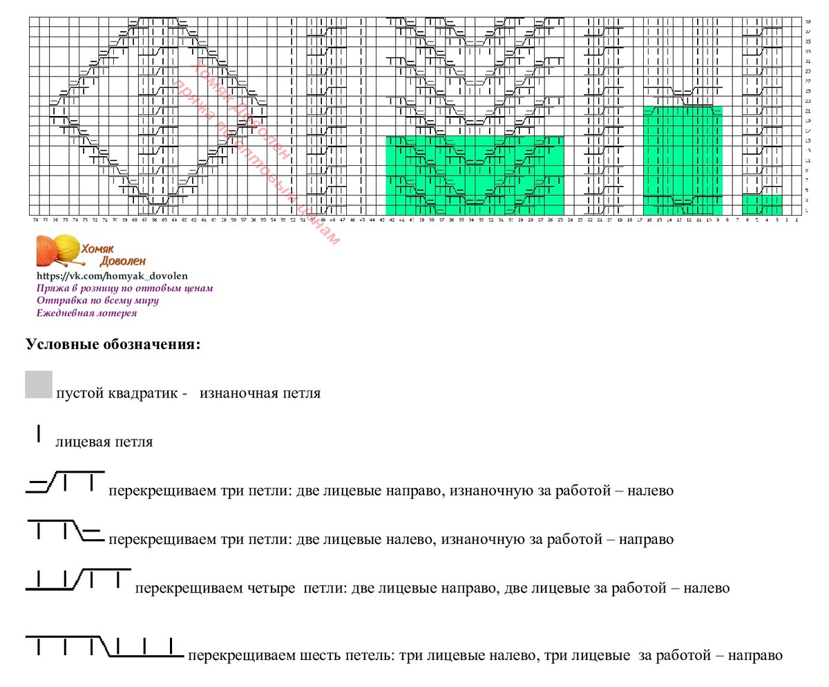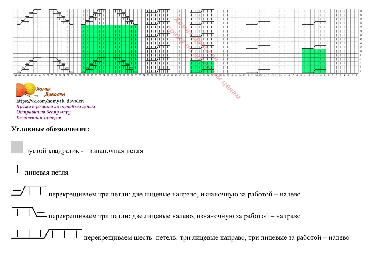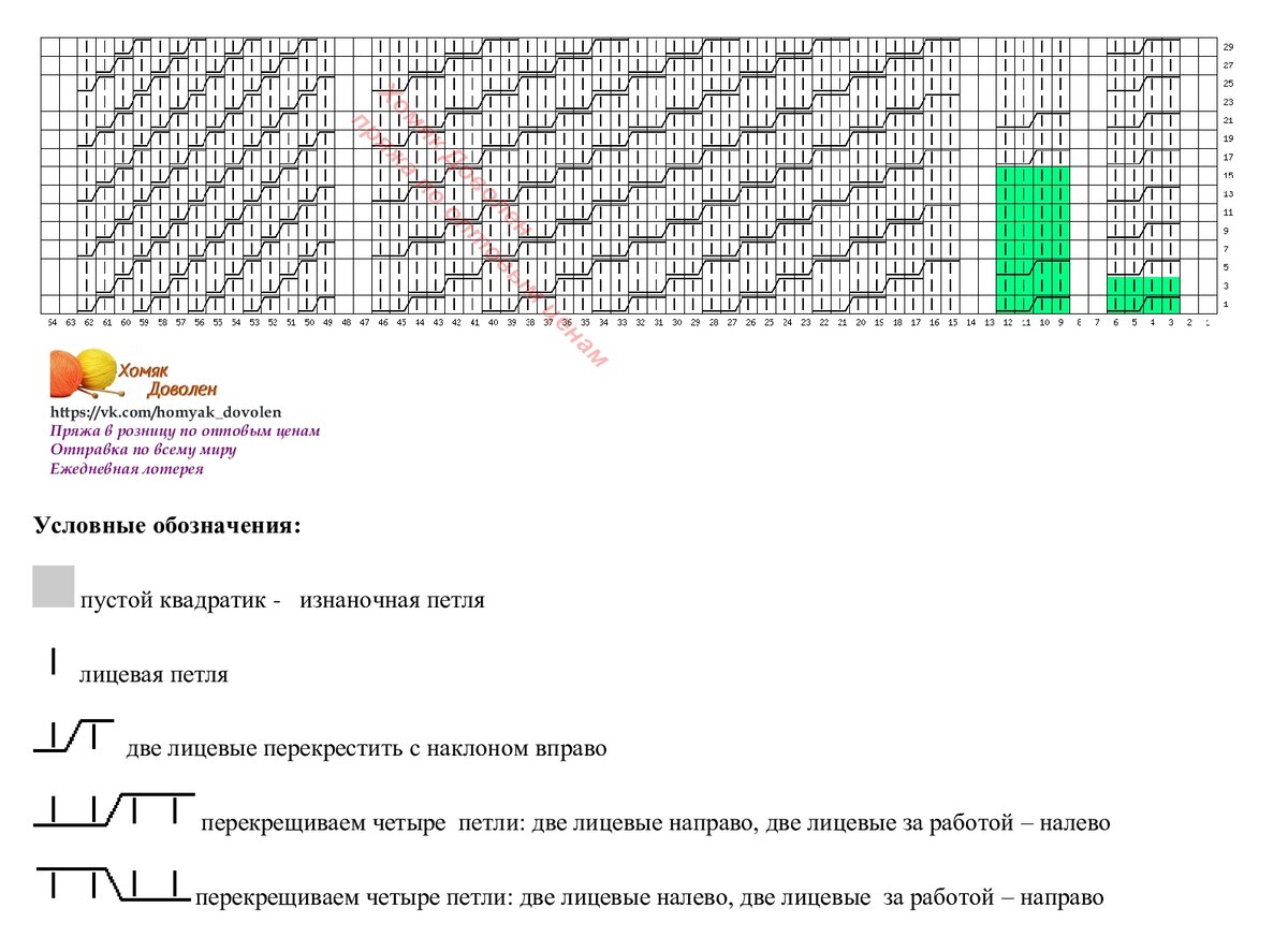 Раппорт теневого узора справа и слева выделен зеленым цветом. Внимание, теневой узор вяжется в каждом ряду, если хочется получить результат, как на фото. А если это не принципиально, можно вязать только в лицевых рядах, а в изнаночных - по рисунку.