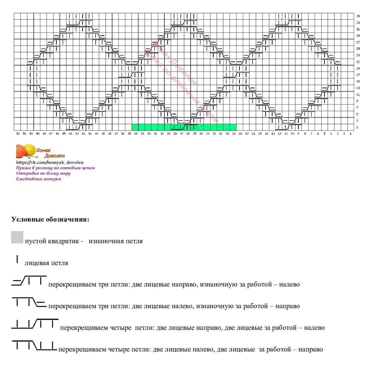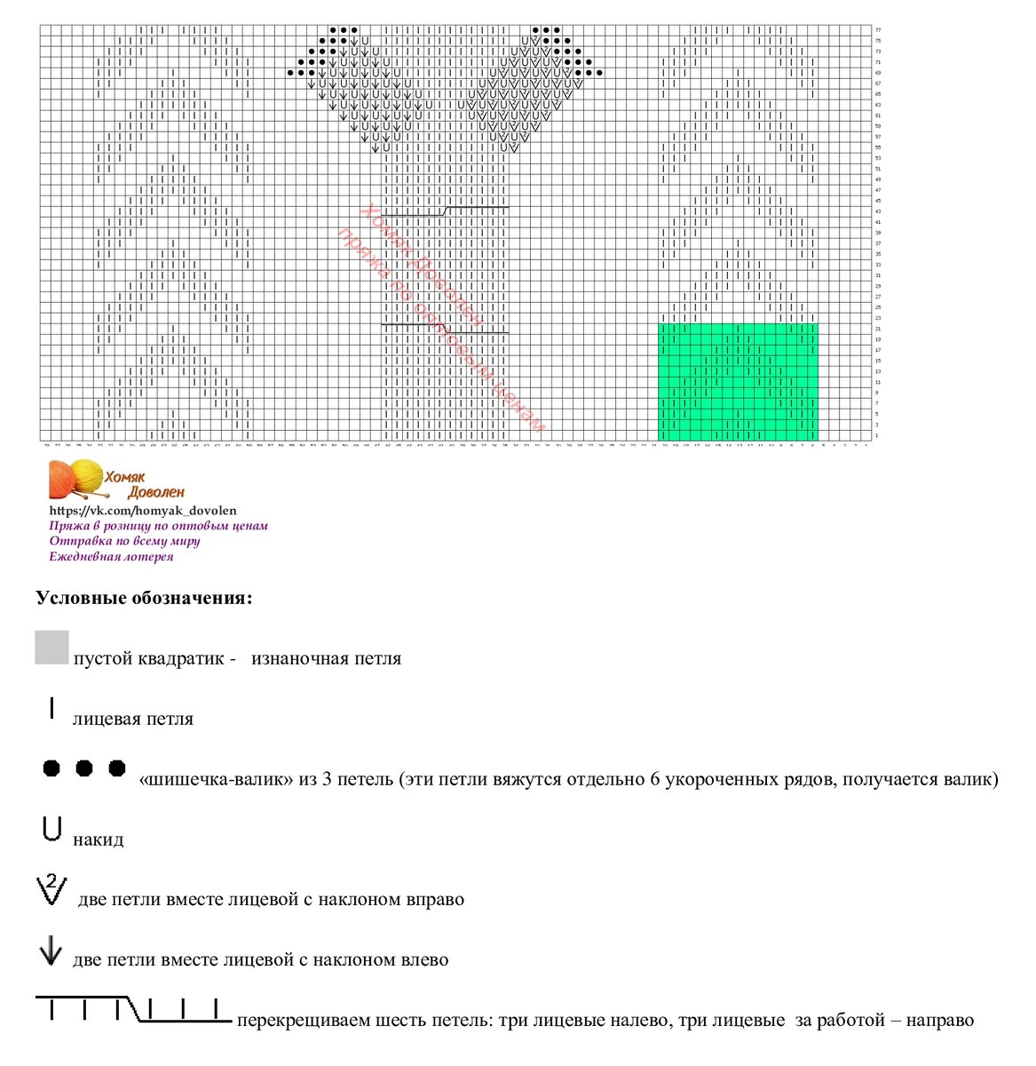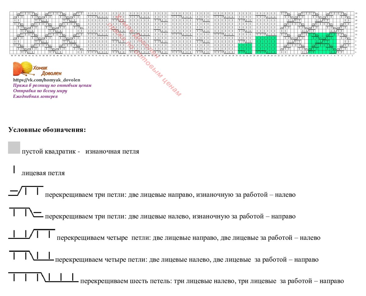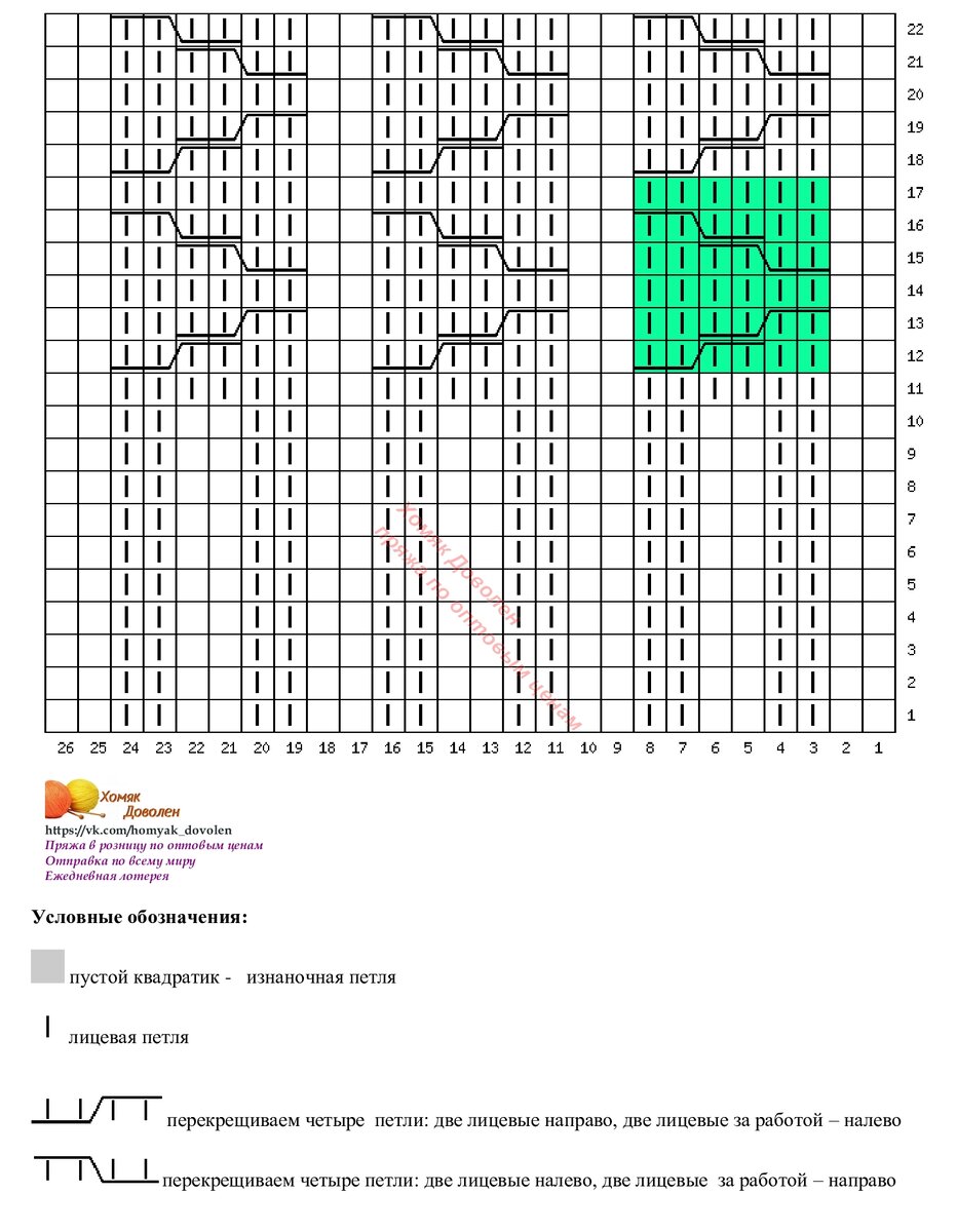 Раппорт теневого узора справа и слева выделен зеленым цветом. Внимание, теневой узор вяжется в каждом ряду, если хочется получить результат, как на фото. А если это не принципиально, можно вязать только в лицевых рядах, а в изнаночных - по рисунку.