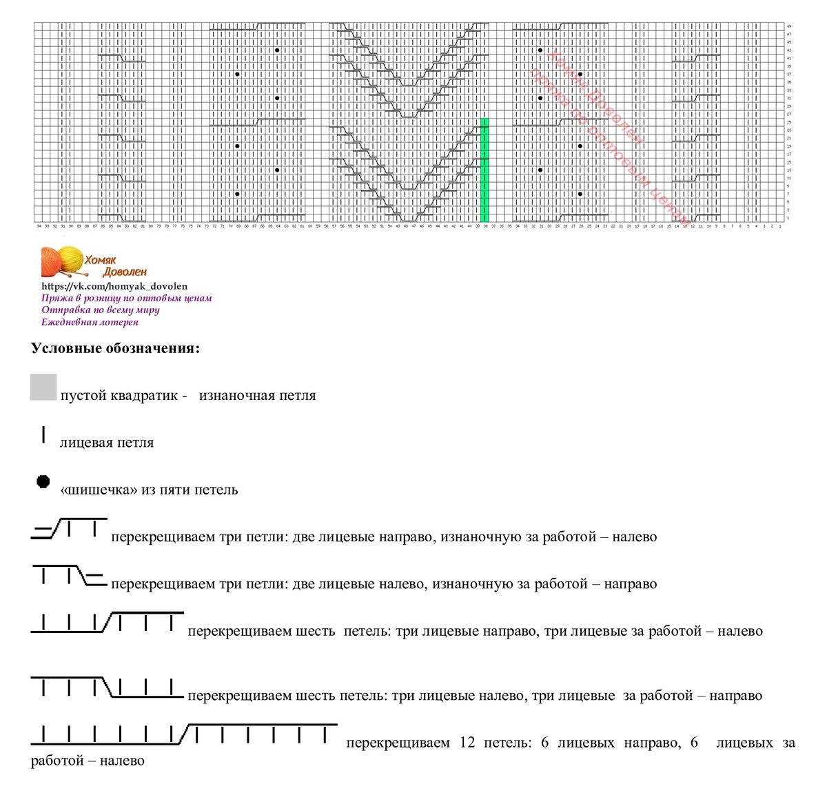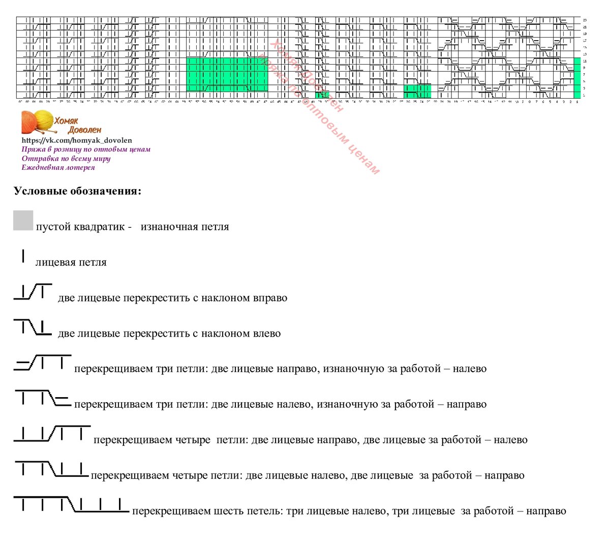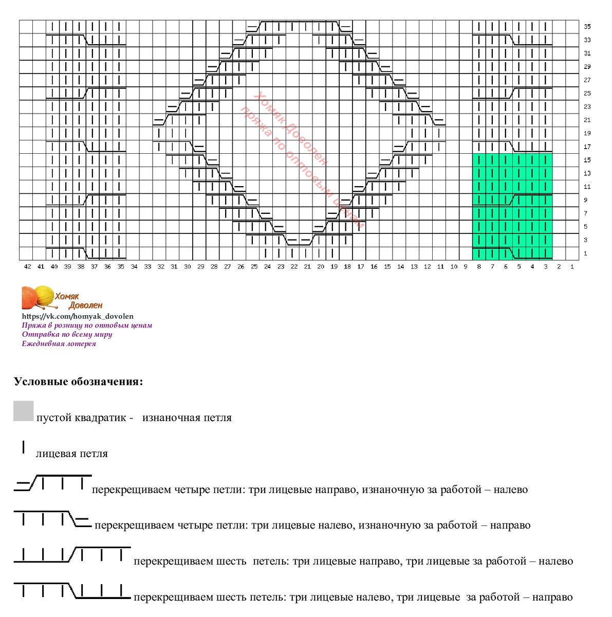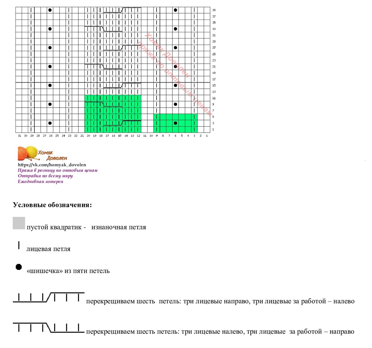 Раппорт теневого узора справа и слева выделен зеленым цветом. Внимание, теневой узор вяжется в каждом ряду, если хочется получить результат, как на фото. А если это не принципиально, можно вязать только в лицевых рядах, а в изнаночных - по рисунку.