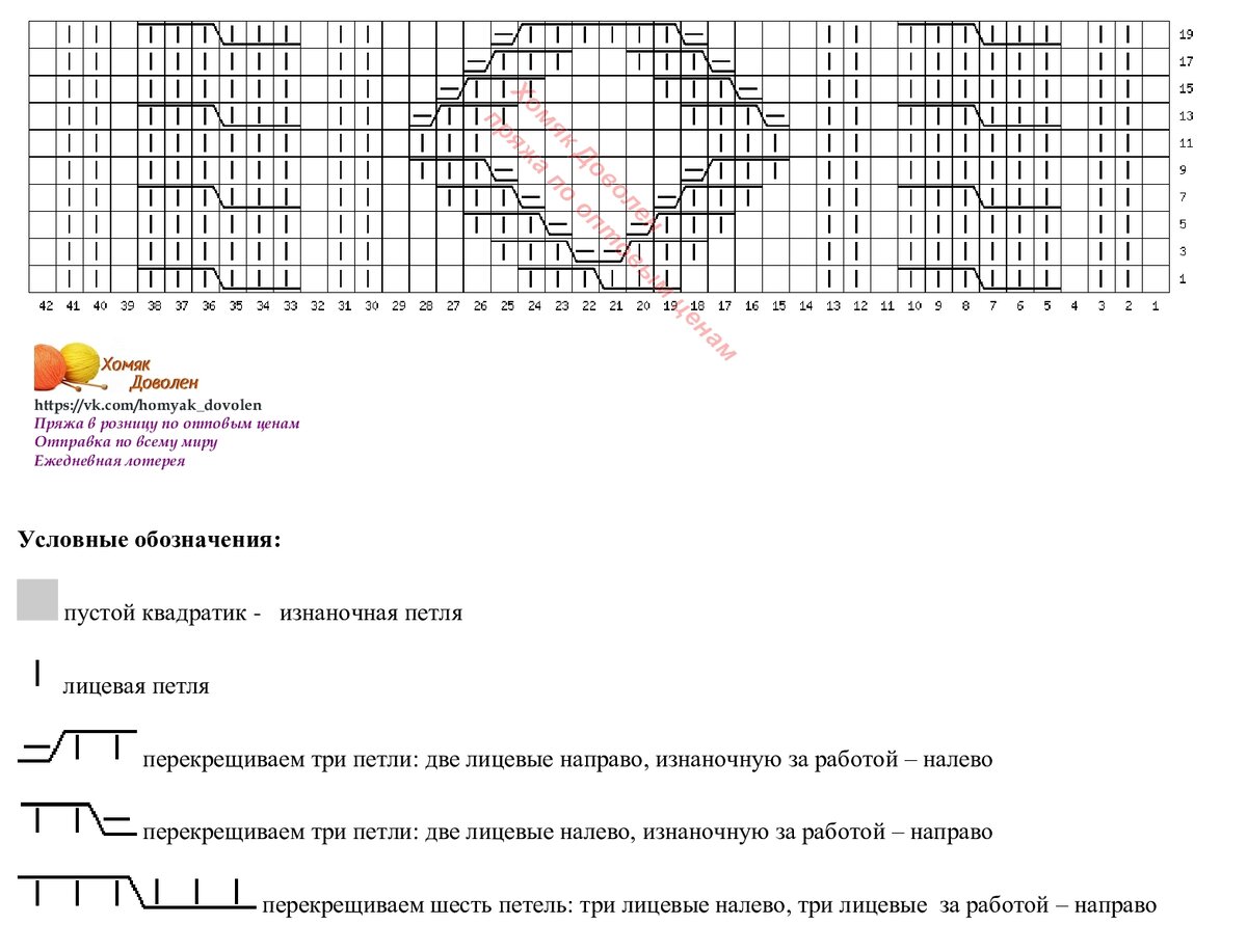 Прямо перед публикацией увидела ошибку - петли 19, 20 и 21 в 3, 5 и 7 рядах - там изнаночная петля.