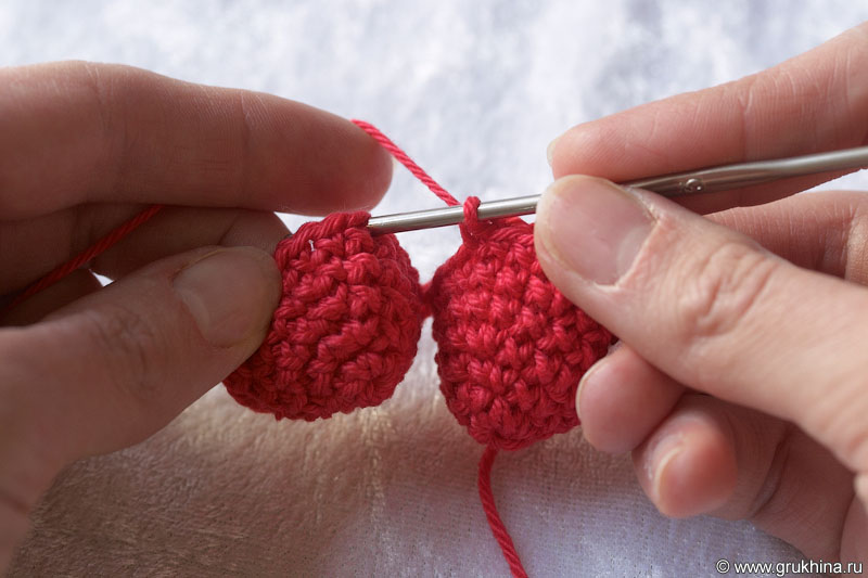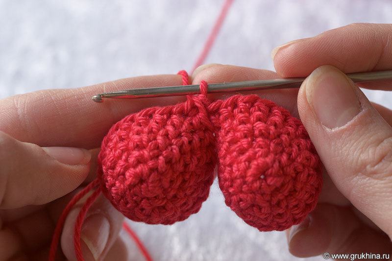 3. Одеть петлю первой чашечки на крючок и продолжить вязание по кругу первой чашечки, используя рабочую нить: