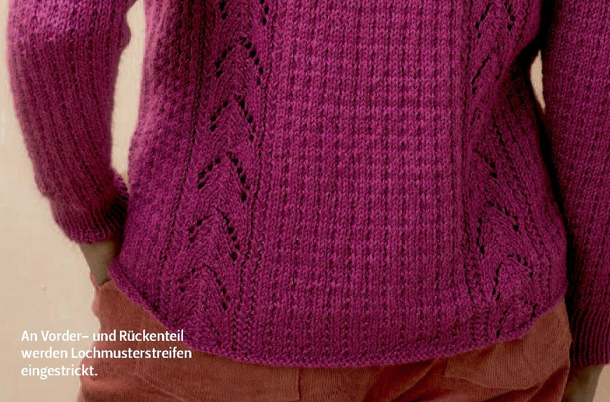 2-й ряд: 15/21/24/26/32/34 п. изн., 2-й ряд ажурного узора, 35/35/41/47/47/53 п. изнаночной гладью, 2-й ряд ажурной полосы узора, 15/21/24/26/32/34 изн. (прим. автора статьи: т.е. все петли изн.)