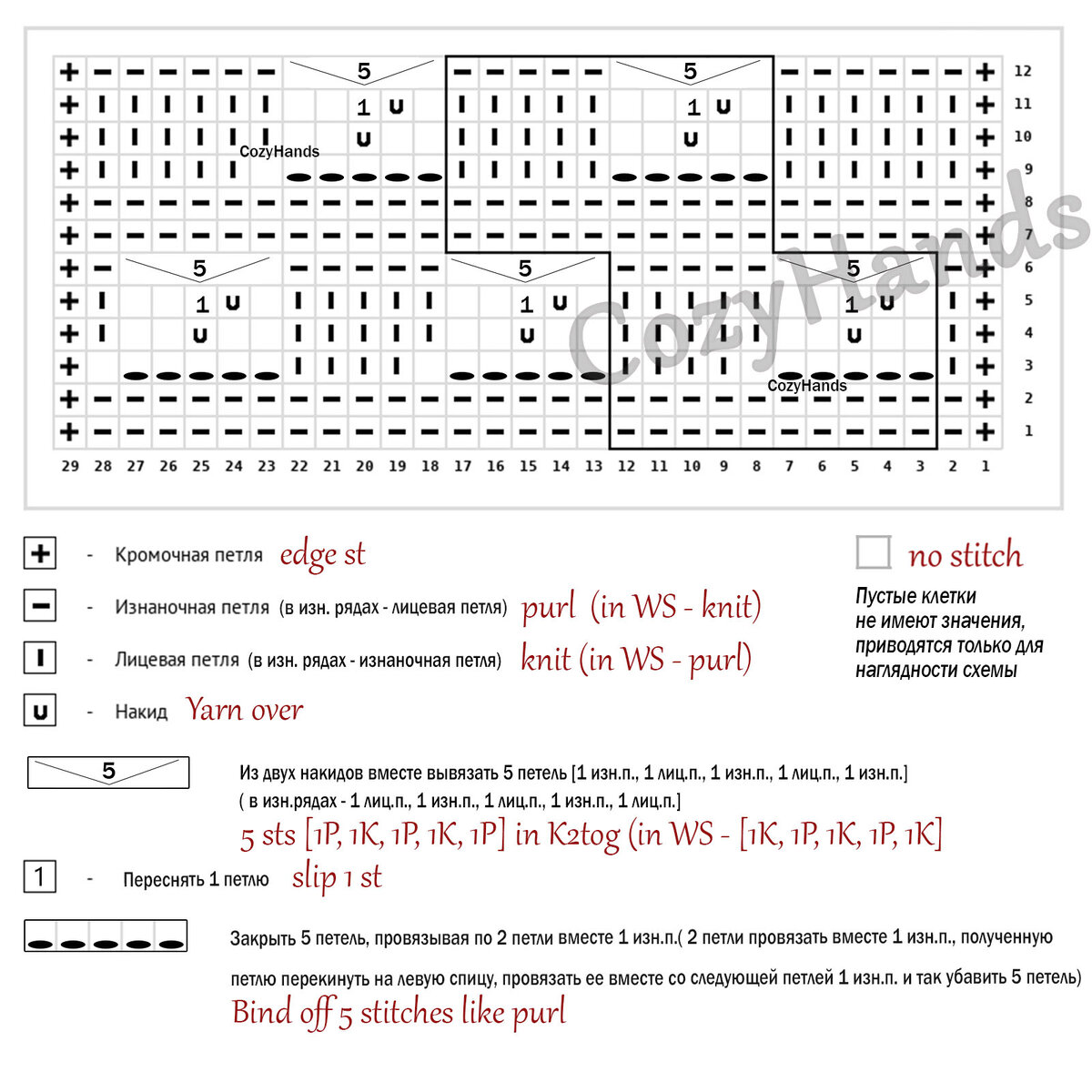 Раппорт узора состоит из 10 петель и 12 рядов.