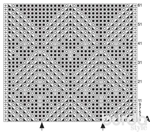 Набрать 131 (141) 163 п. и вязать 1 изн. р. изнаночными. Далее вязать ажурным узором А, начиная после кром. с 8 п. перед правой стрелкой, вязать 7 (8) 9 раз раппорт из 16 п., заканчивать 9 п. после левой стрелки и кром.