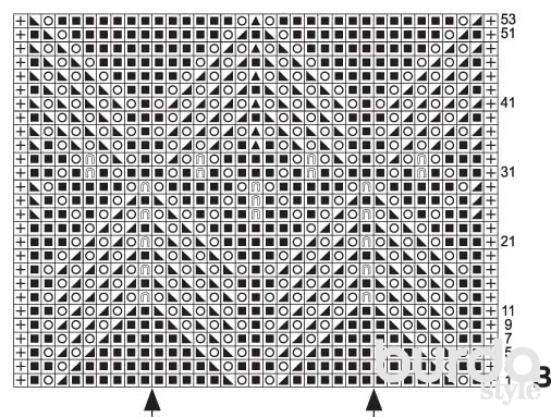 В след. лиц. р. вязать ажурным узором В, начиная после кром. с 8 п. перед правой стрелкой, вязать 5 (6) 7 раз раппорт из 16 п., заканчивать 9 п. после левой стрелки и кром.