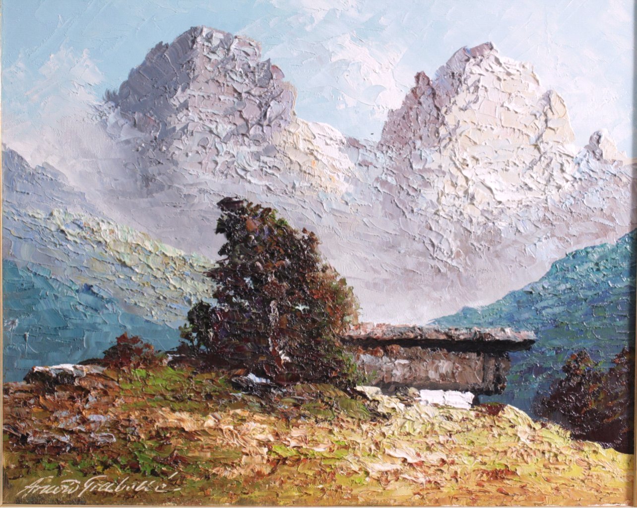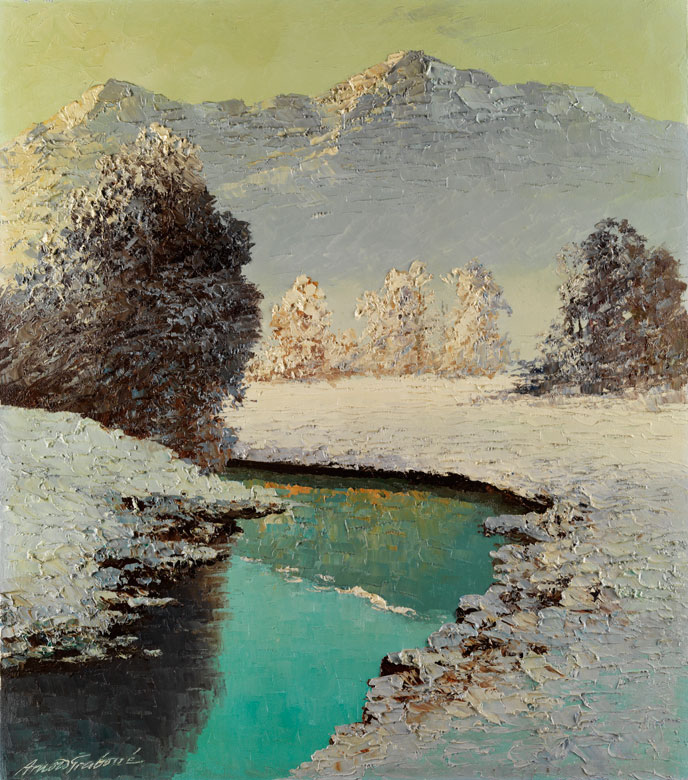 Арнольд-Грабоне стал известен благодаря своему неповторимому, уникальному стилю живописи «Палитра». Его техника заключалась в использовании текстуры густой краски, чтобы создать реальное трехмерное изображение пейзажа, и "palette knife" - палитрового ножа (или мастихина). Напомню, что мастихин - это инструмент для живописи, визуально похожий на лопатку или шпатель. Его название имеет итальянское происхождение (от mestichino – 'шпатель'). В произведениях Грабоне цвета отличаются своим блеском, отличая его пейзажи от других художников-паллетно-ножевой техники. Блеск является результатом техники цветоделения Graboné в ножевой живописи. В его работах вы можете увидеть красивые цвета, которые отличают его работу от других художников. Совершенство достигается с помощью техники разделения цвета в живописи.