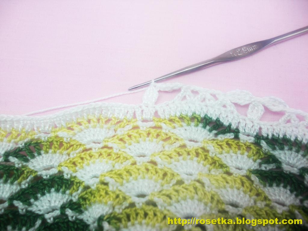 32р. 3Вп подъёма, по 1Ссн в каждую петлю «веера ракушки»( всего на «веере» должно получиться 13Ссн),3Ссн под арку, повторить этот раппорт по кругу.