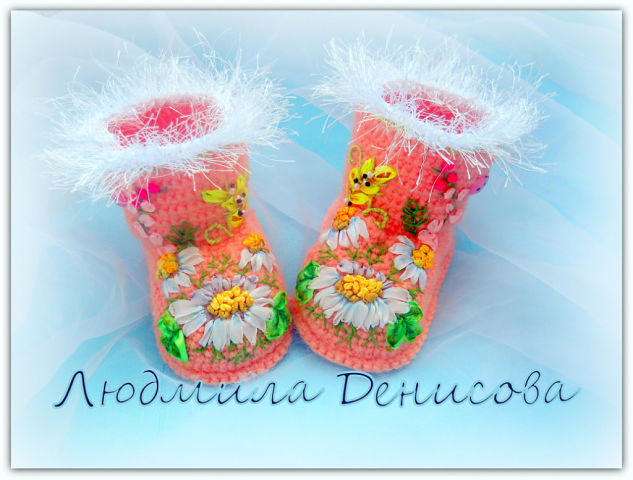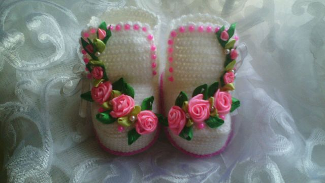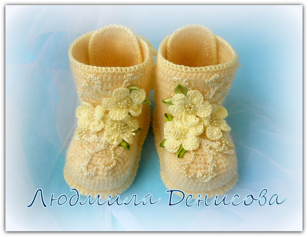 Я сама буквально на днях связала несколько пар пинеток для своей трехмесячной внучки. Конечно, старалась, чтобы смотрелись они красиво на маленьких ножках, но, важнее, по-моему, чтобы были они теплыми и мягкими... В общем, связала такие обычные, пушистые, теплые пинеточки с помпончиками))). Однако, есть люди, которые самый обычный предмет "грудничкового" гардероба превращают в настоящий шедевр. Вот увидела это чудо, и аж дух захватило! Ну, и конечно, возникло непреодолимое желание сотворить такую (или хотя бы почти такую) красоту для нашей маленькой принцессочки. Надеюсь, получится, ведь я пинетки вяжу на спицах, а тут крючок. А им я вяжу редко, несмотря на то, что вязать крючком Бабушка научила меня раньше, чем я научилась писать первые буквы... Ой, что-то я отвлеклась) Давайте на чудо-башмачки любоваться и вдохновляться этой красотой)))
