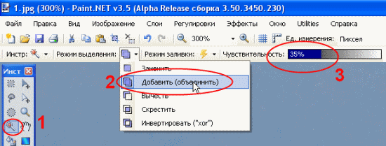 Волшебную палочку» (пункт 1 на скриншоте), выберите режим выделения «Добавить (объединить)» (пункт 2) и установите порог чувствительности на 35 % (пункт 3):
