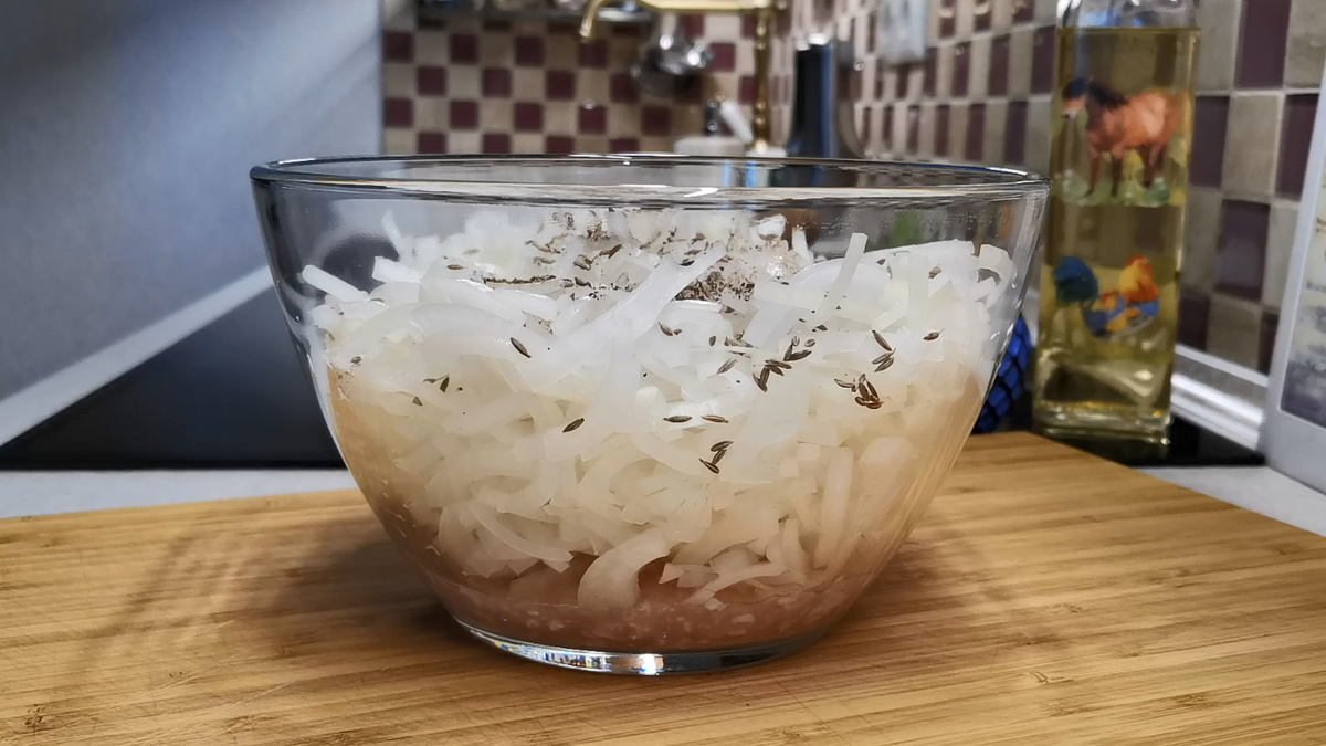 Что дальше? Солим, перчим все это дело и хорошенько проминаем руками, чтобы лук стал мягким и полупрозрачным. Ох, сколько сока он даст! 👍