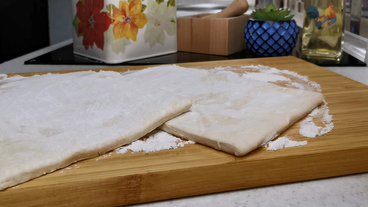 Теста у нас должна быть стандартная упаковка, а в ней два одинаковых пласта. Раскатываем каждый до размеров примерно 30х45 см. Стол и само тесто присыпаем мукой. Катаем в любом направлении. Вот хоть тресни, разницу я никогда не ощущаю, хоть так катай, хоть только в одну сторону.