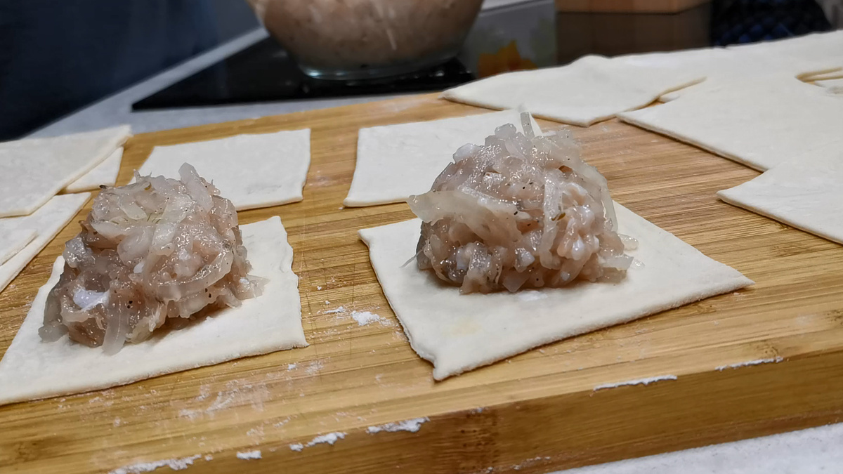 Разрезаем каждый пласт на 15 частей, ровных таких квадратиков. В серединку одного квадратика укладываем начинку. Не жалеем, кладем от души. Тем более, что об экономии нам и думать не нужно. У нас там фарша расход мизерный.