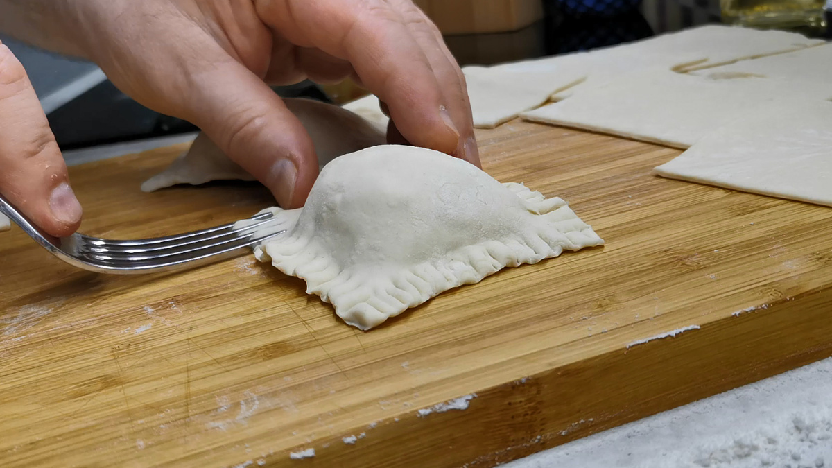 Накрываем начинку вторым квадратиком, придавливаем края пальчиками и потом проходимся вилочкой по всему периметру. Так нам и смазывать края не потребуется, и красиво получится.