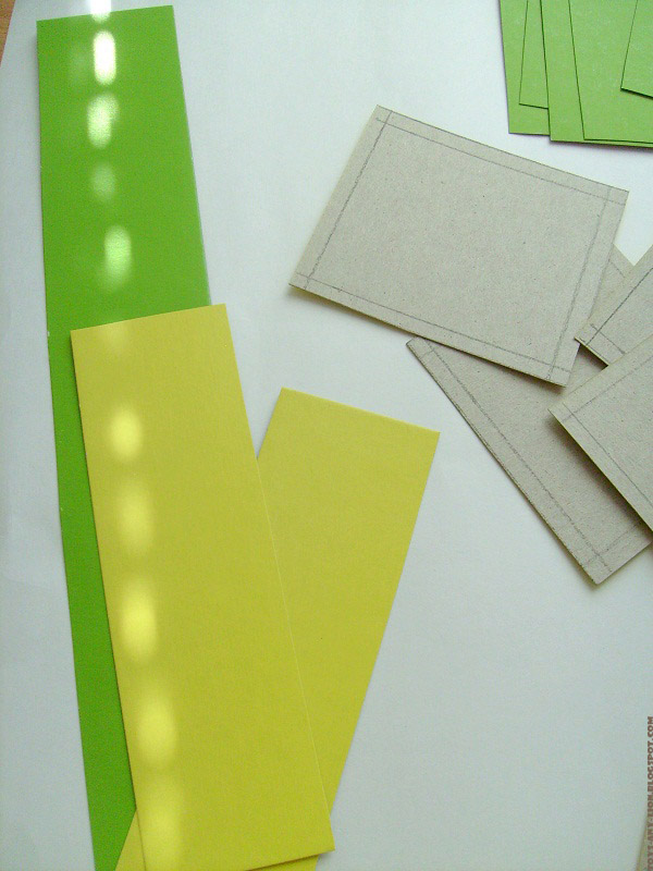 Теперь беремся за наши остатки от картона. Полосы разрезаем на маленькие прямоугольники, у меня получились размером 4,5см х 2,5см, 4,5см х 3см, 4,5см х 4см. Всего 19 штук, это будут наши ценники.