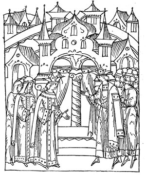 Миниатюра из летописного Лицевого свода посвящена смотринам царских невест.