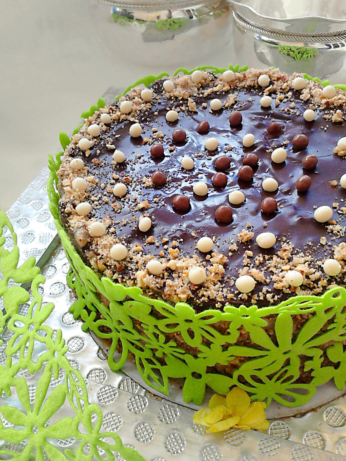 4.Бока торта обсыпать измельченным миндалем. Торт украсить по желанию.