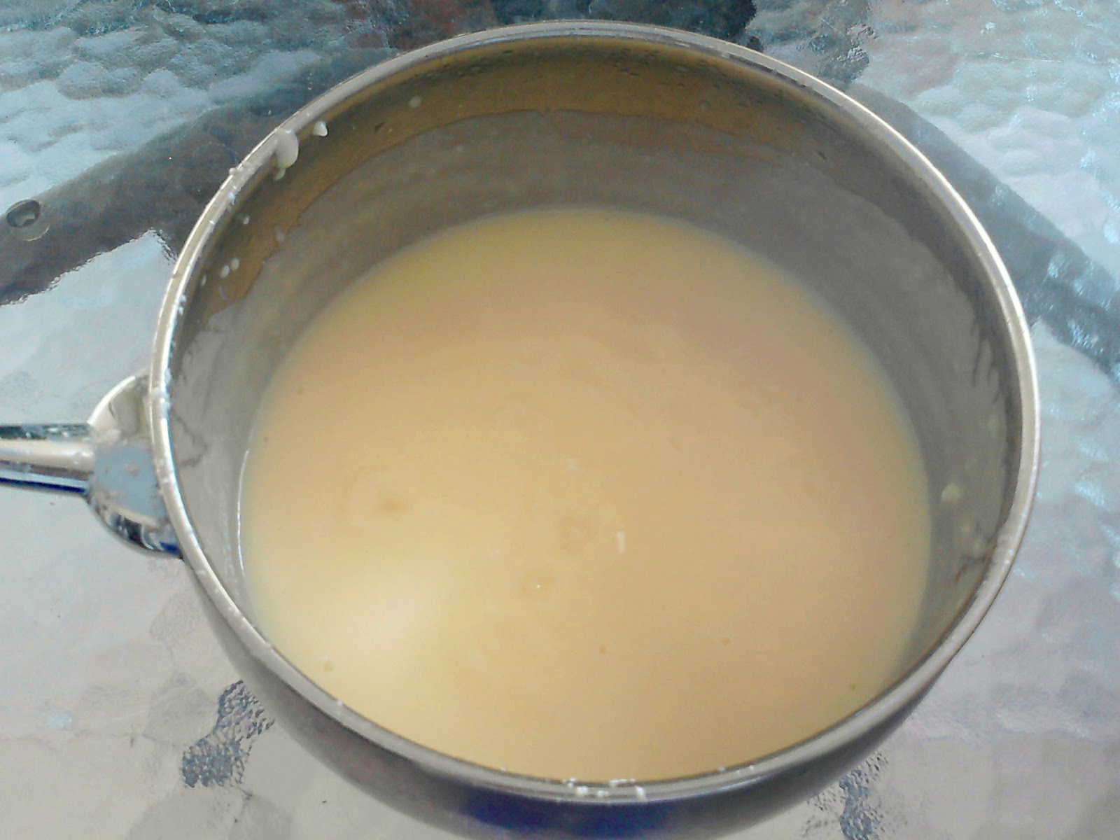 Добавить молоко и взбить смесь, варить до загустения на среднем огне |