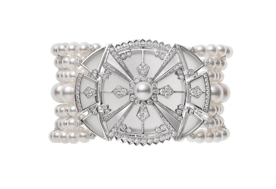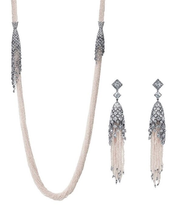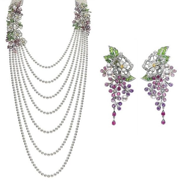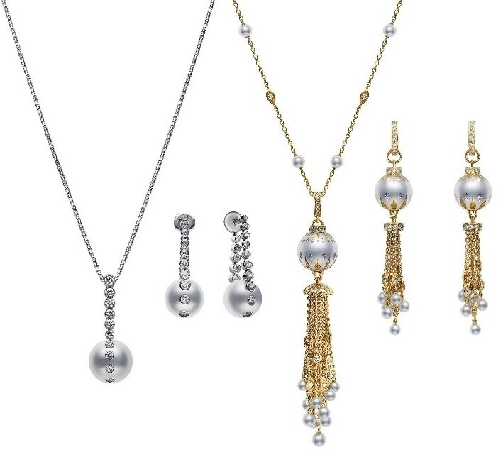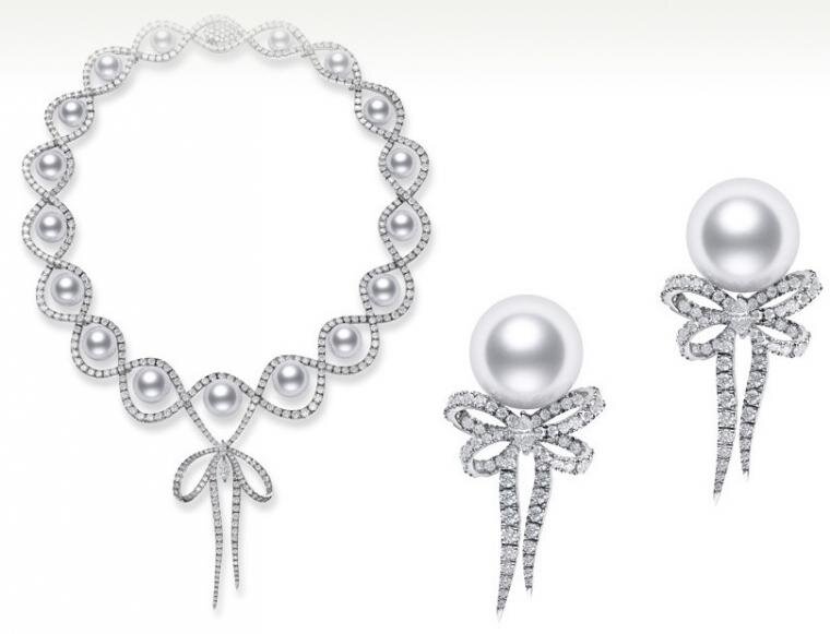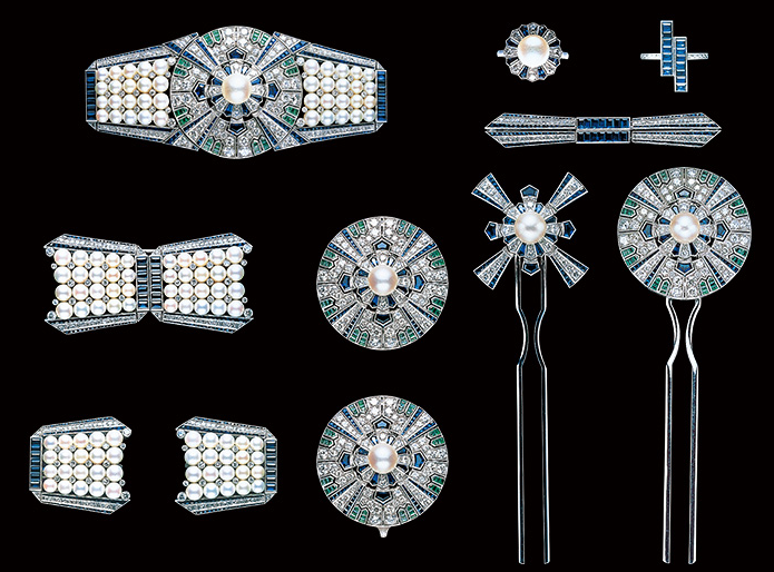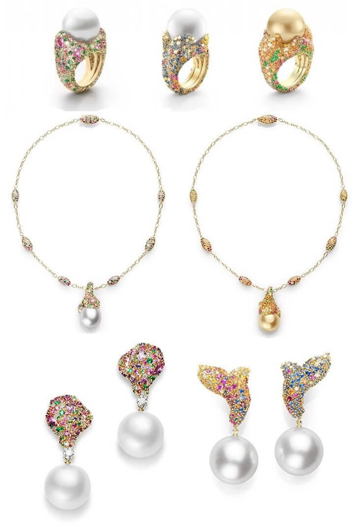 Сет Yaguruma (включает пояс из семи рядов жемчужин диаметром 5–9 мм, браслет и две подвески) обыгрывает дизайн ажурной драгоценной пряжки с крупной центральной жемчужиной. Отборный жемчуг южных морей украшает комплект Praise To Nature c мотивом бриллиантовых соцветий. В ансамбле Les Pétales Place Vendôme жемчужины диаметром 11–13 мм обрамлены изящными розовыми лепестками, усыпанными бриллиантовым паве.