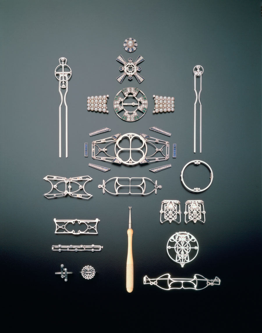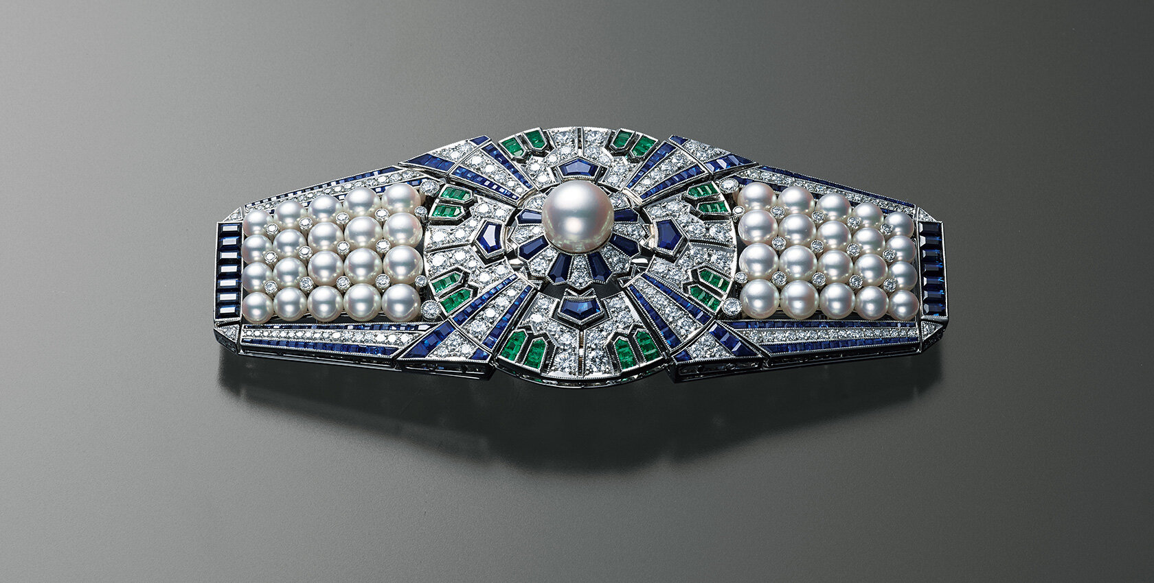 1. Подвеска Yaguruma 2. Колье-воротник из жемчуга 3. Серьги Les Petales Place Vendome 4. Украшение-трансформер Yaguruma, 1937 год 5. Подвеска Praise to Nature