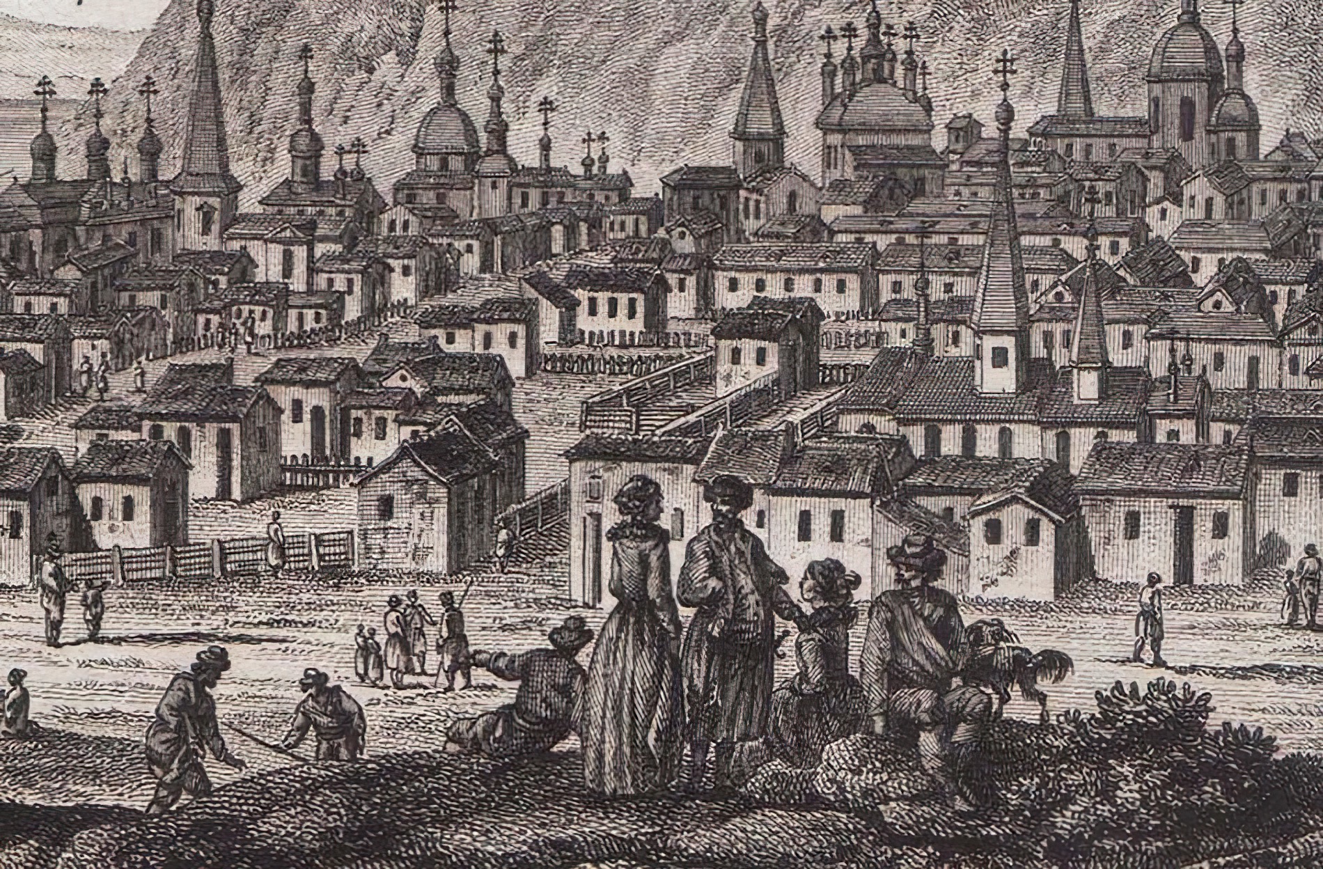 Гравюра с видом на город Тобольск. Дата в правом верхом углу: 1786.