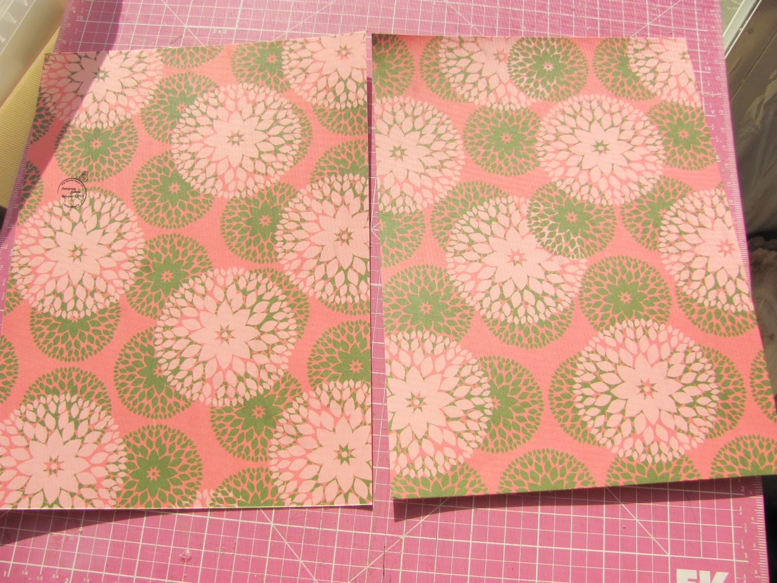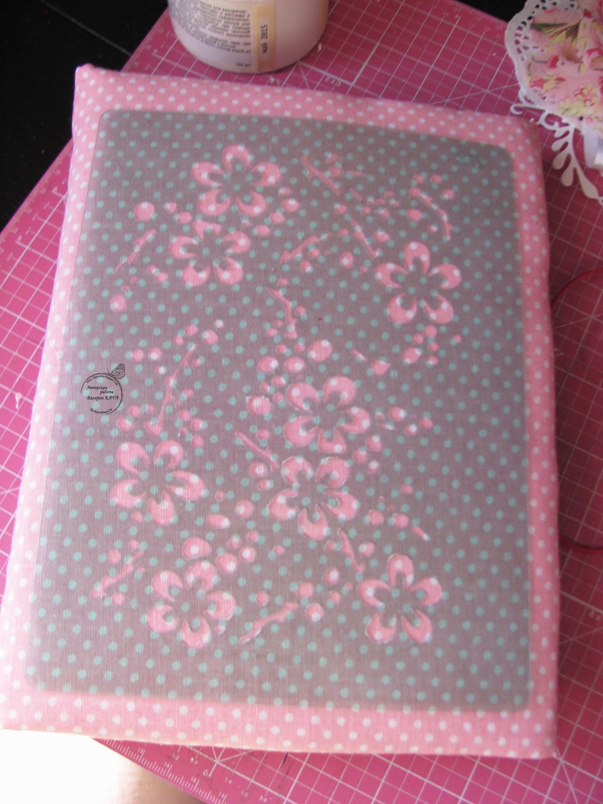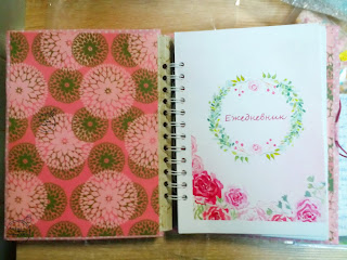 к обложке приклеиваем скрапбумагу,которая оборачивала пружину и накрываем форзацем