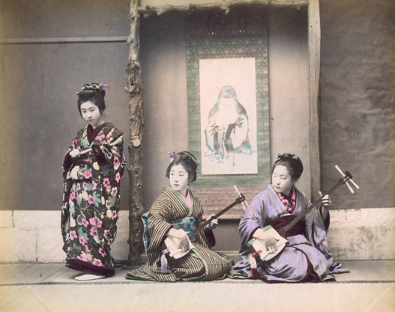 #08010202 -- $235.00 -- Three Dancers [показать]Type: Albumen - Hand Colored Image Size: 8 1/2 x 10 1/2 in Title/Subject: Photograph Studio: Kimbei (probably) Mounted on cardboard measuring 11 x 13 3/4 in Condition: Premium - Fine.