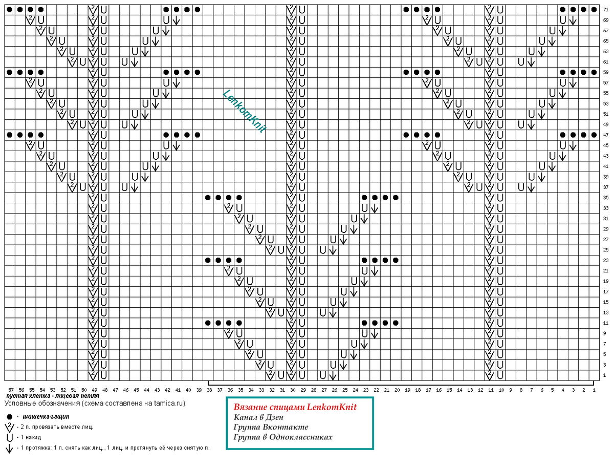 На схеме - один раппорт ажурных веточек с шишечками в высоту (72 ряда). В ширину каждая веточка занимает 19 петель. При вязании нужно учитывать, что узор размещается симметрично центральной веточке.