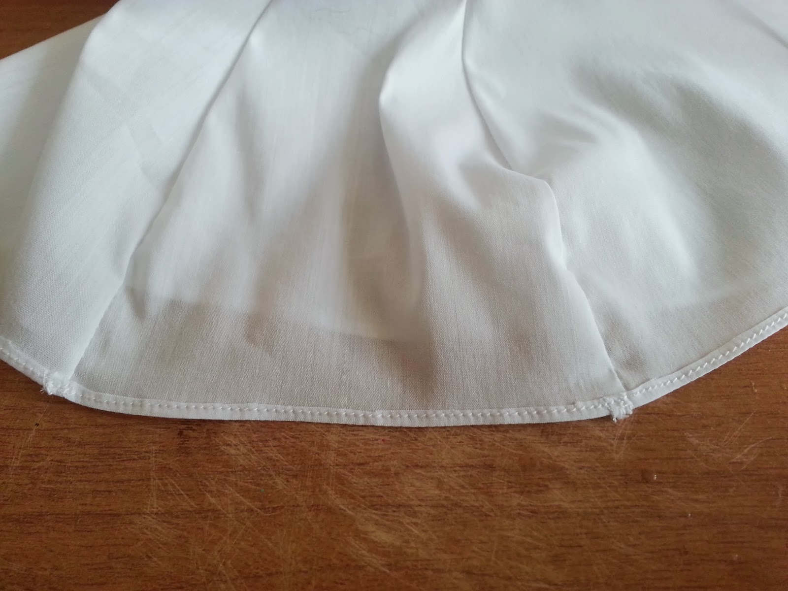 Сострачиваем клинья зонта сначала попарно, а потом все вместе. Обрабатываем края и низ изделия. Я застрочила низ зонта на лицо, с изнанки будет не видно, а с лица будет закрыто тесьмой. Получится цивильненько так. Обрезаем очень близко к шву.