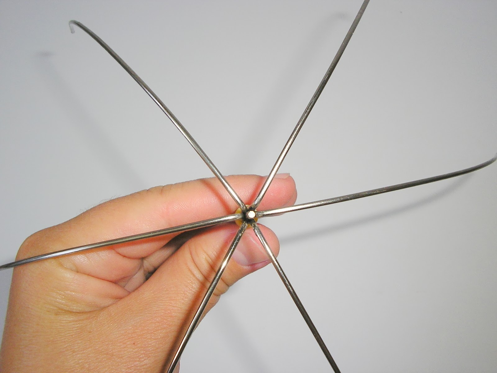 Распределяем спицы диаметрально по кругу. Я еще суперклея капнула прям в серединку резинки, в центр, для пущей прочности. Оказывается Супермомент гель офигенно склеивает железки, руки, пальцы, ноги и ...по списку! Берите тот, что синенький в маленьком тюбичке.