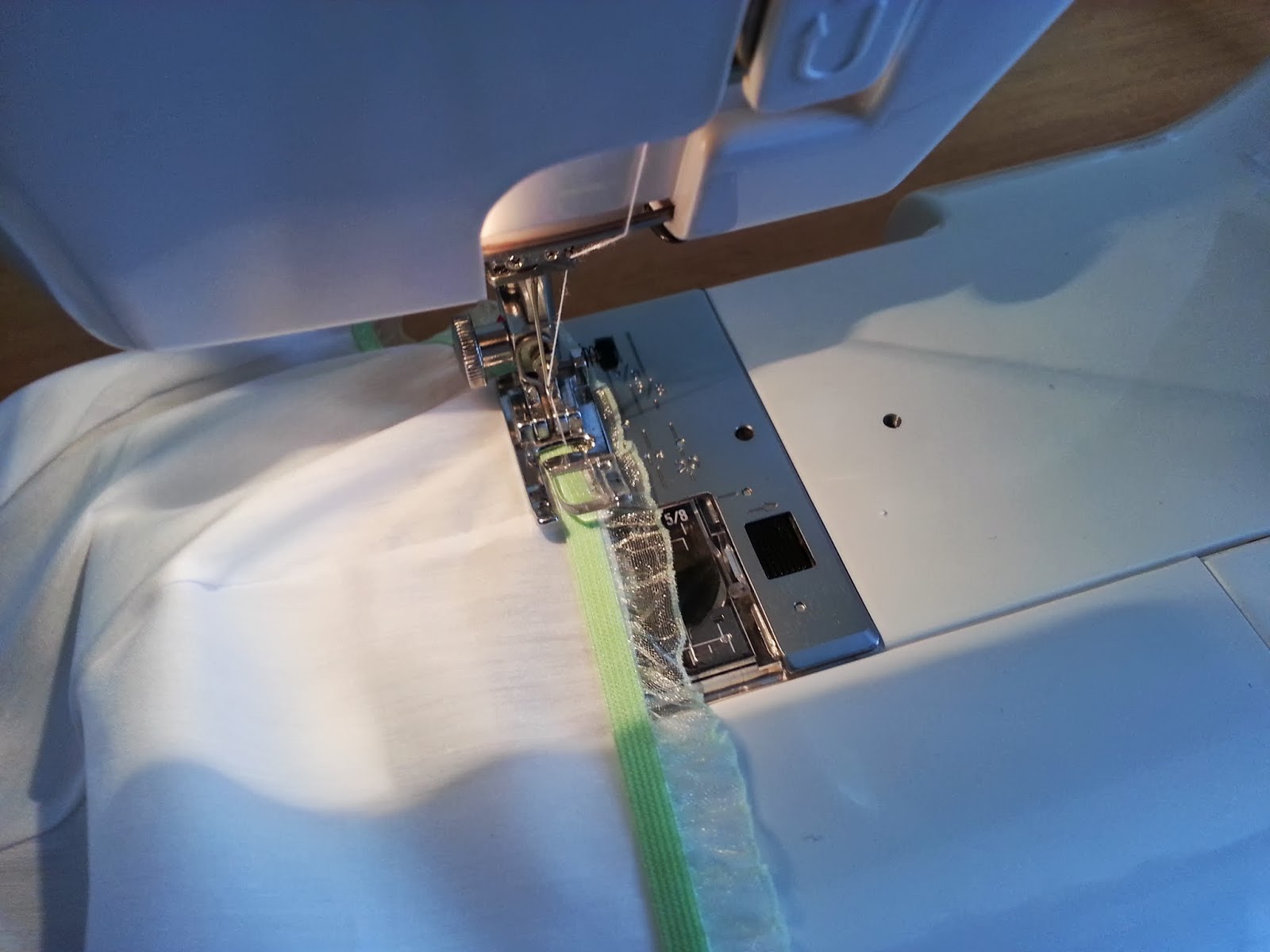 Берем тесьму и пришиваем по нижнему краю купола, чуть-чуть натягивая, вот прям совсем чуть-чуть. Нам не надо сильной сборки, нам надо, чтоб при натягивании купола эта самая тесьма-резинка помогала куполу плотно прилегать к спицам.