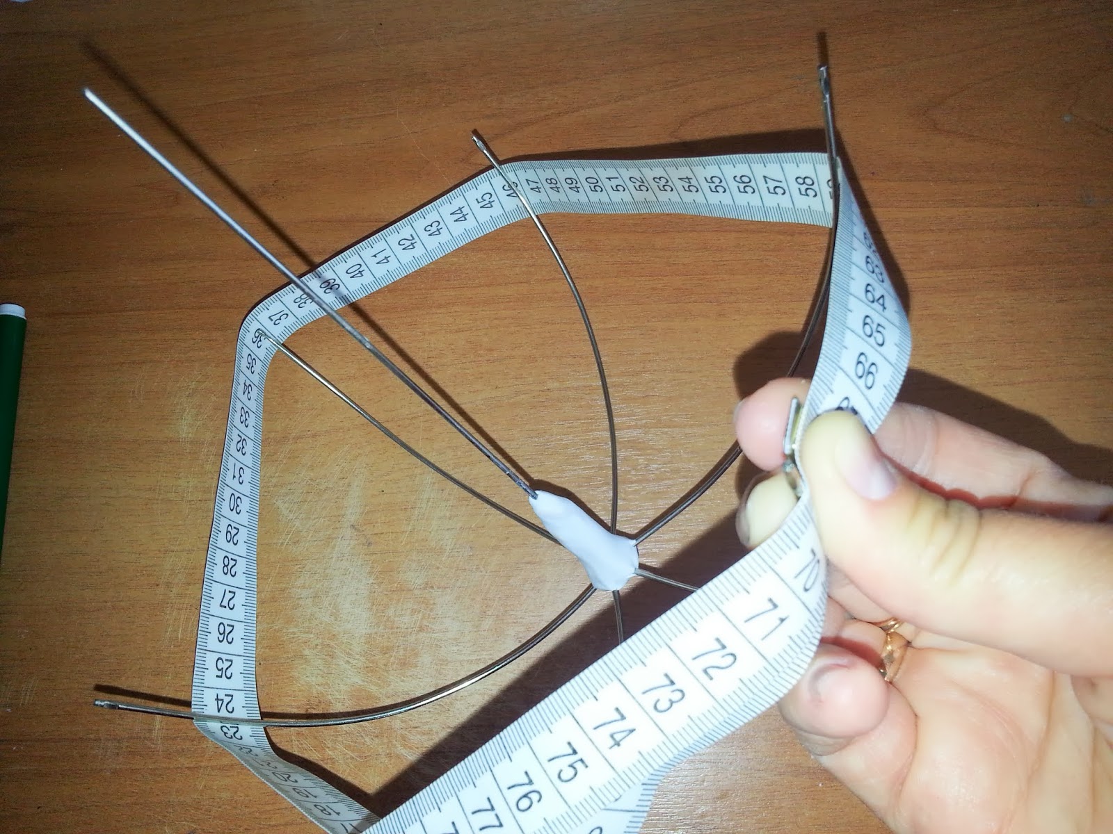 Берем то , из чего будут спицы и гнем по шаблону. Это может быть согнутая ранее спица, по нужному вам размеру, а можно, как я , согнуть вокруг, по банке. Гнем , столько сколько будет спиц. Здесь 6 шт. Одну оставляем прямой, это ручка зонта.