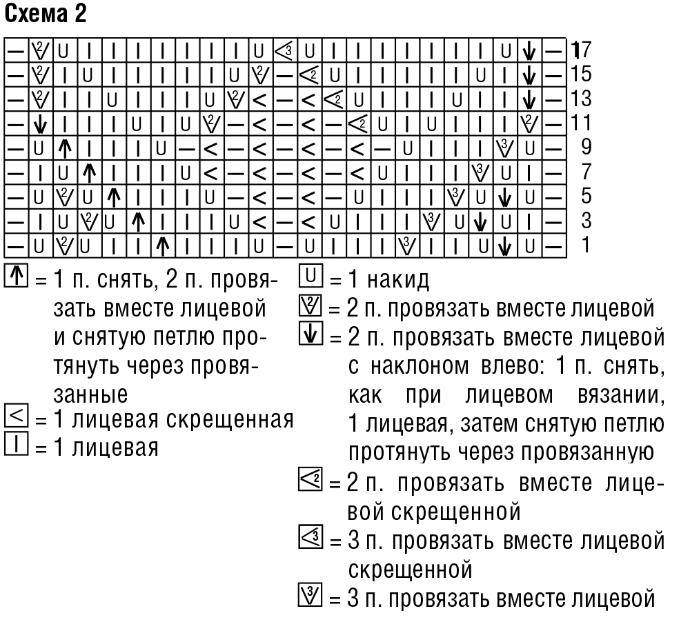 Вязать по схеме 2. На схеме даны только лицевые ряды. В изнаночных рядах петли провязывать по рисунку, лиц. скрещенные — изн. скрещенными. В высоту повторять с 1-го по 18-й ряд. Важно: при выполнении прибавок и убавок следить за тем, чтобы количество накидов и провязанных вместе петель в ряду оставалось одинаковым.