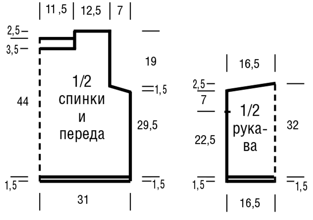 Вязать, как спинку, но для более глубокой горловины закрыть средние 59 п. через 44 см = 136 р. от нижней планки и обе стороны закончить раздельно.