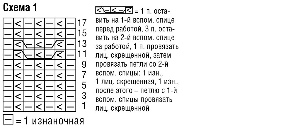 Вязать по схеме 1. На схеме даны только лицевые ряды. В изнаночных рядах петли провязывать по рисунку, лиц. скрещенные — изн. скрещенными. В высоту повторять с 1-го по 18-й ряд.