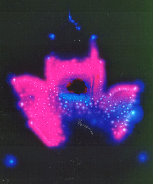 Теперь несколько примеров цветных фотографий, сделанных на обыкновенную цветную плёнку с чувствительностью 200 ISO, которую можно купить в каждом фотомагазине. Данные цветные фотографии получены естественным путём, т.е. без какой-либо цифровой обработки. Именно эти цвета получаются на цветной фотоплёнке, а затем и на фотобумаге. Именно этим ценен этот метод, который фиксирует эти цветовые эффекты в определённом алгоритме, зависящим от принципа реакции фотоплёнки на кирлиан-эффект, о чём подробно говорится ниже.