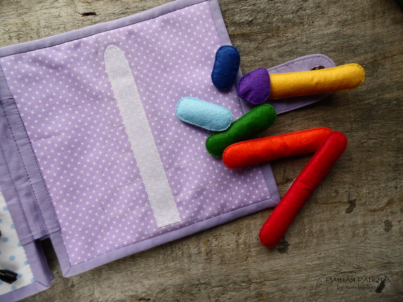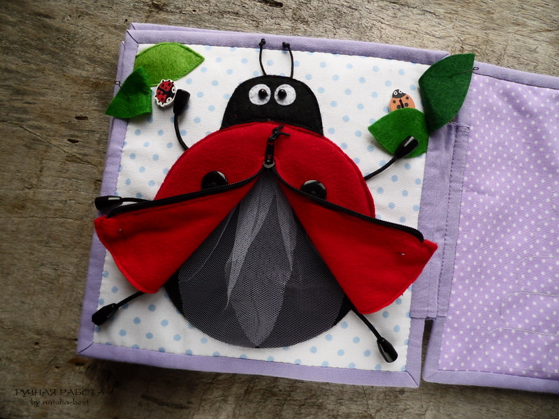 На четвертом развороте разместились любимица заказчиков – божья коровка с застежкой «молния» и новый элемент – пирамидка, которая учит понятиям больше/меньше, а также цветам. Ну, кто помнит из детства: «Каждый Охотник Желает Знать Где Сидит Фазан» ))) Пирамидка тоже крепится на липкой ленте «велкро».