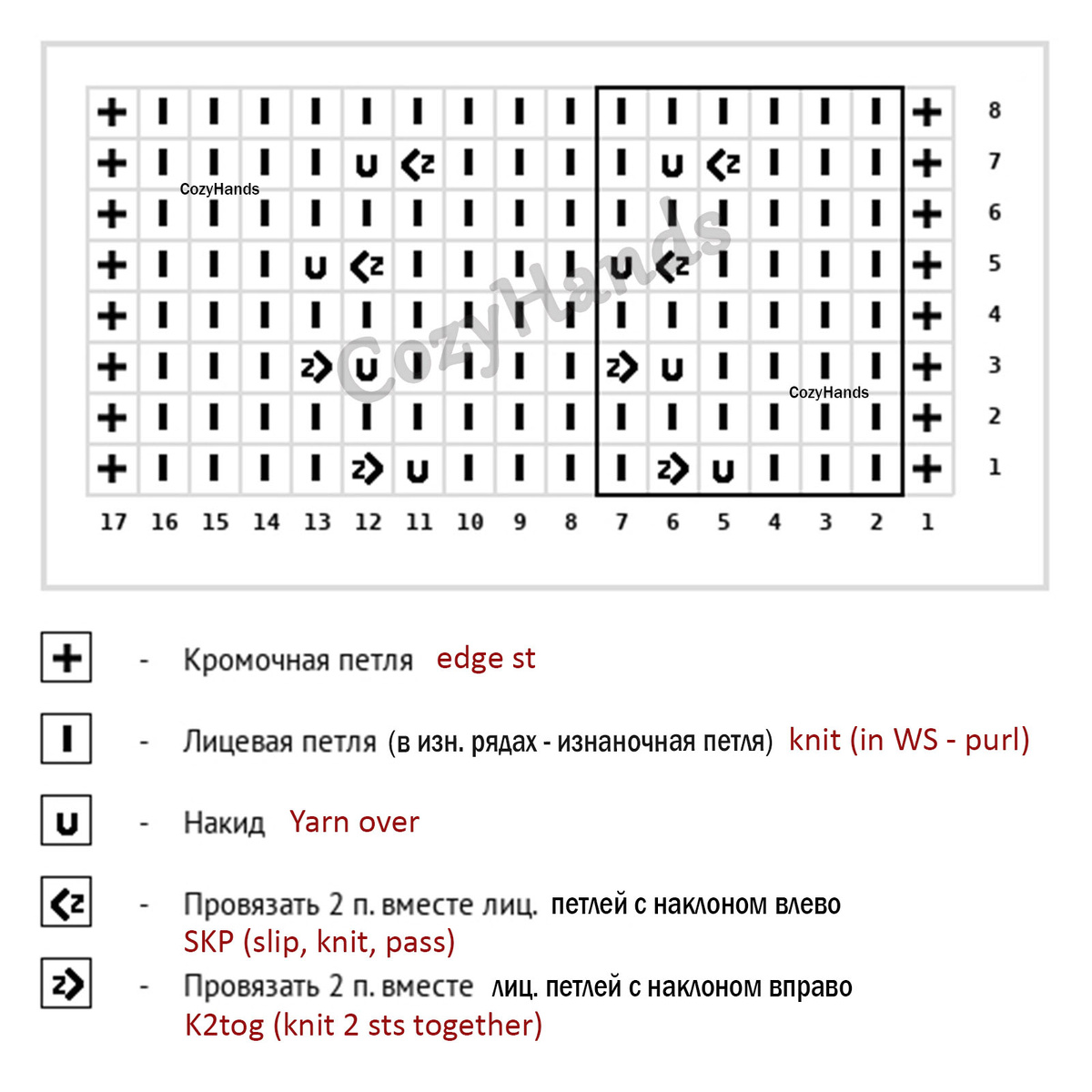 7 ряд: кром.п., * 3 лиц.п., 2 петли провязать вместе 1 лиц.п. с наклоном влево 1 накид, 1 лиц.п.,* 3 лиц.п., кром.п.