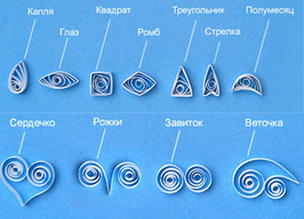 Квиллинг — это своего рода лего из бумажных завитков, поэтому сначала предлагаем вам картинку на которой изображены основные, базовые элементы, из которых можно собрать все.