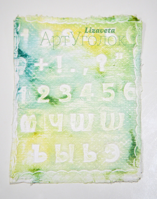 Шаг 3. Когда все слои бумаги у нас намокли и склеились, берем штамп (я выбрала крупный алфавитный штамп) и аккуратно кладем на нашу заготовку. После этого сильно надавливаем на каждую букву (цифру), чтобы они очень хорошо продавили нашу заготовку.