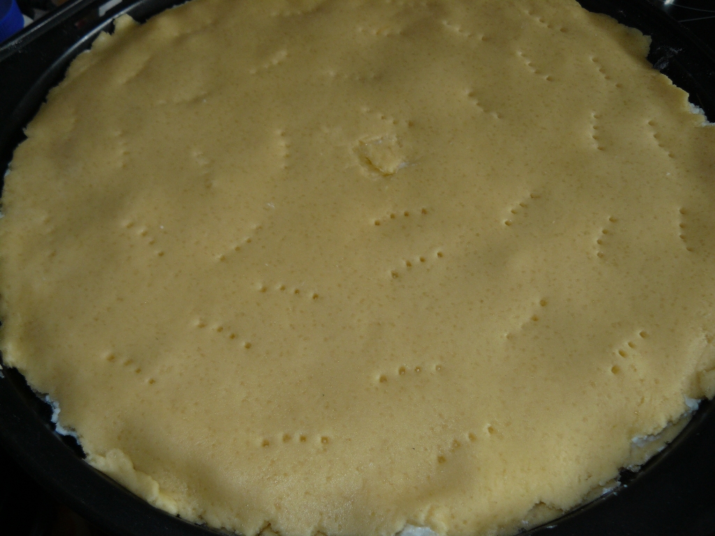 Тесто довольно эластичное и раскатываем мы довольно тонко. Чтобы перенести раскатанный пласт в форму, надо еще потрудиться. Но я делаю этотак: слегка присываю мукой, чтобы не слипалось, быстро, но аккуратно накручиваю на скалку и также быстро раскатываю в форму.