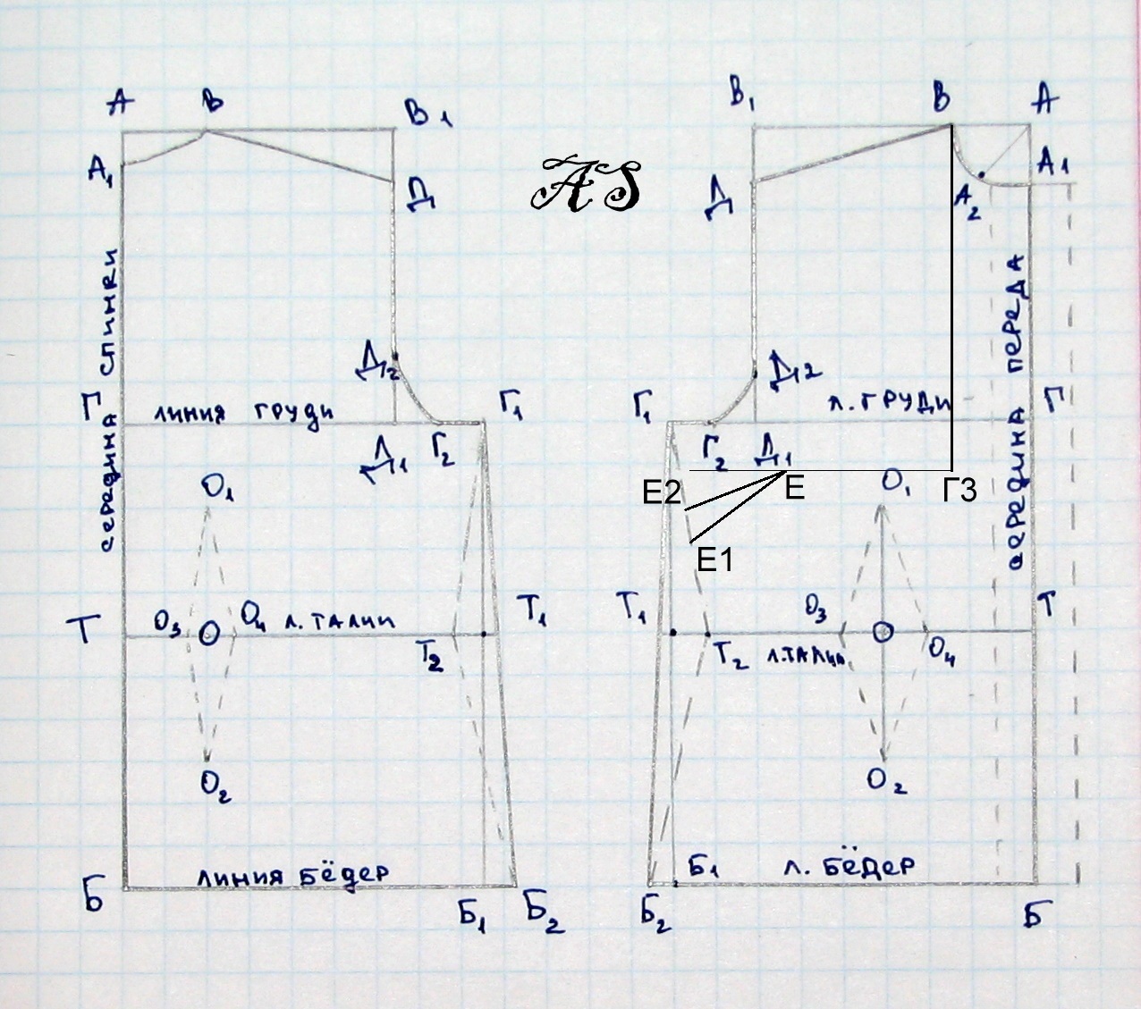 По лиии горловины ВА1, от точки В вниз отложить 2 см (для всех размеров) и поставить точку О. ОГ2-прямая линия.