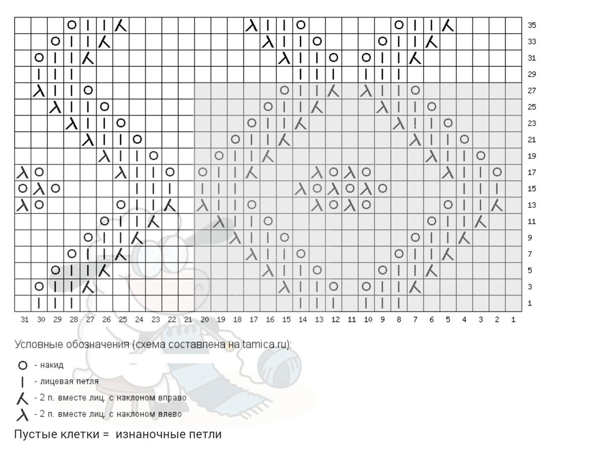 В схеме указаны только лицевые (нечётные) ряды. В изнаночных (чётных) рядах петли провязывать по рисунку, накиды изнаночными.