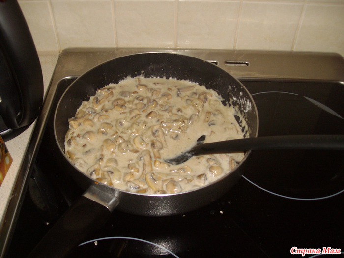 Добавить муки и обжарить, добавить сметану и молоко, потушить до получения очень густой подливы.