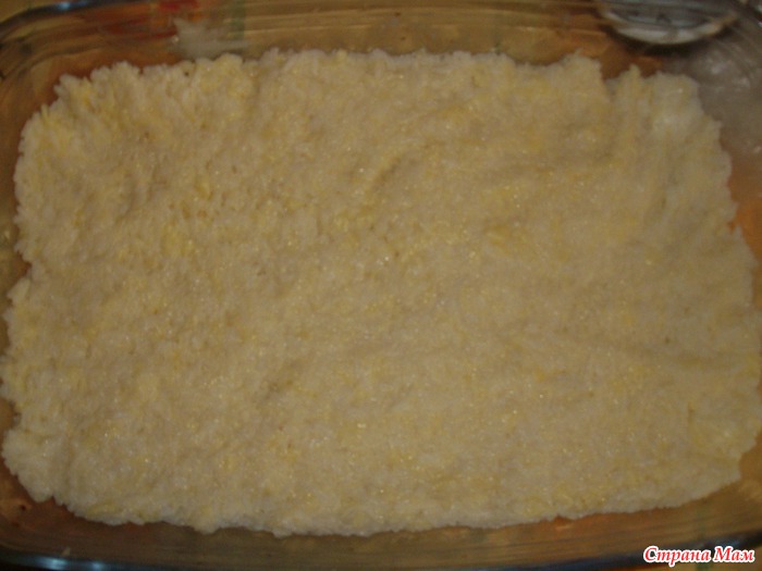Рисовое тесто выложить на смазанную сливочным маслом форму, плотно примять.