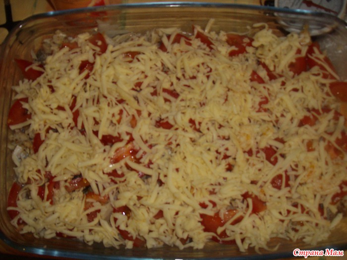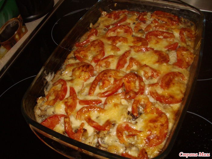 Сверху выложить грибы. На слой с грибами положить консервированную треску, можно какую-нибудь другую обжаренную или вареную рыбу, если нет рыбы, то не класть, будет не хуже. Наверх положить порезанный помидор и засыпать оставшимся тертым сыром.