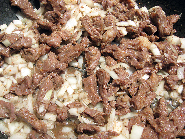 Как только вода выкипит, добавляем к мясу растительного