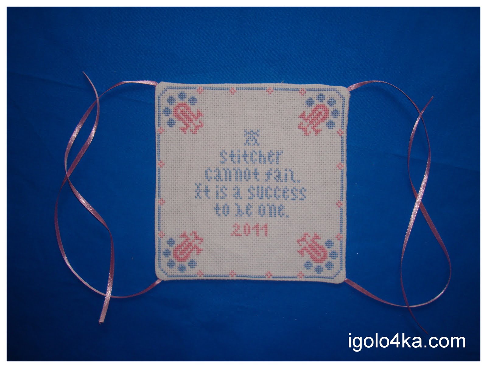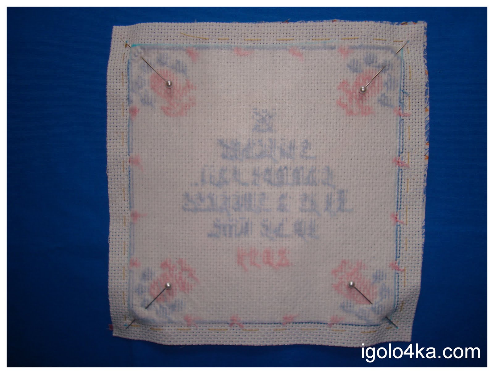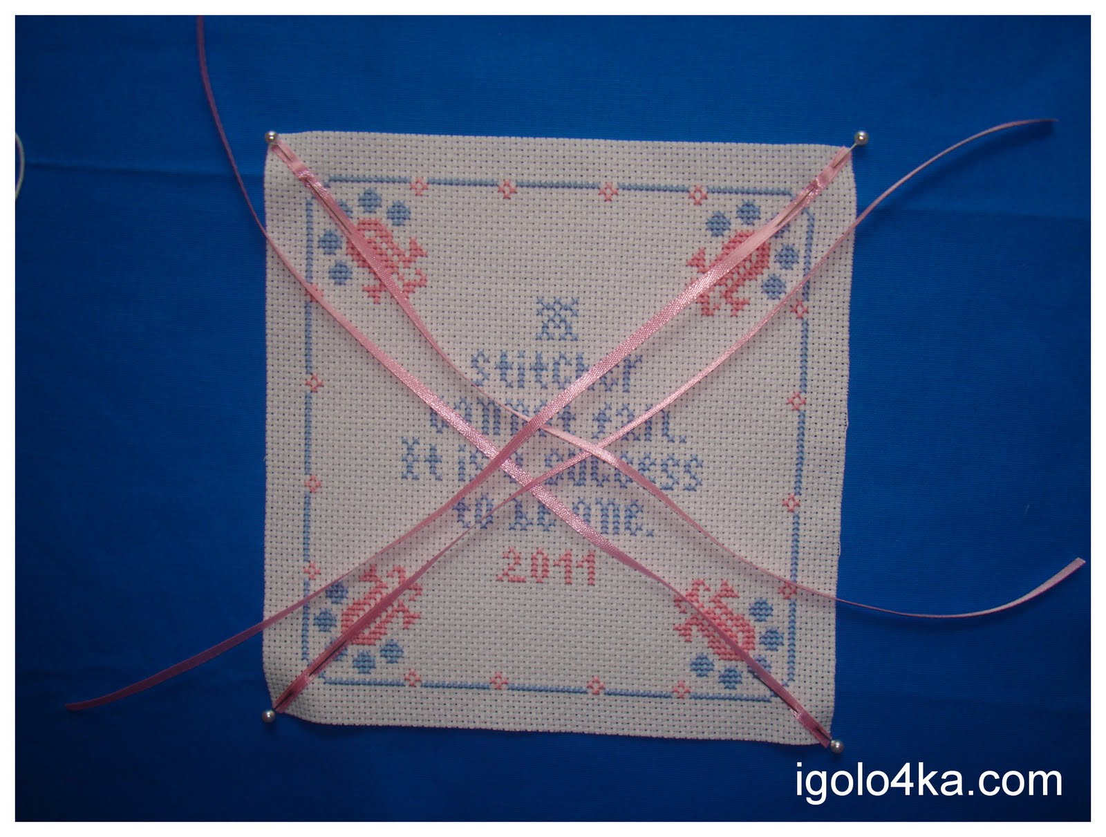 Держа нашу вышивку лицевой стороной вверх, прикалываем булавками ленточки в уголках нашей вышивки. Основная часть ленточек должна быть расположена внутри нашего вышитого квадрата.