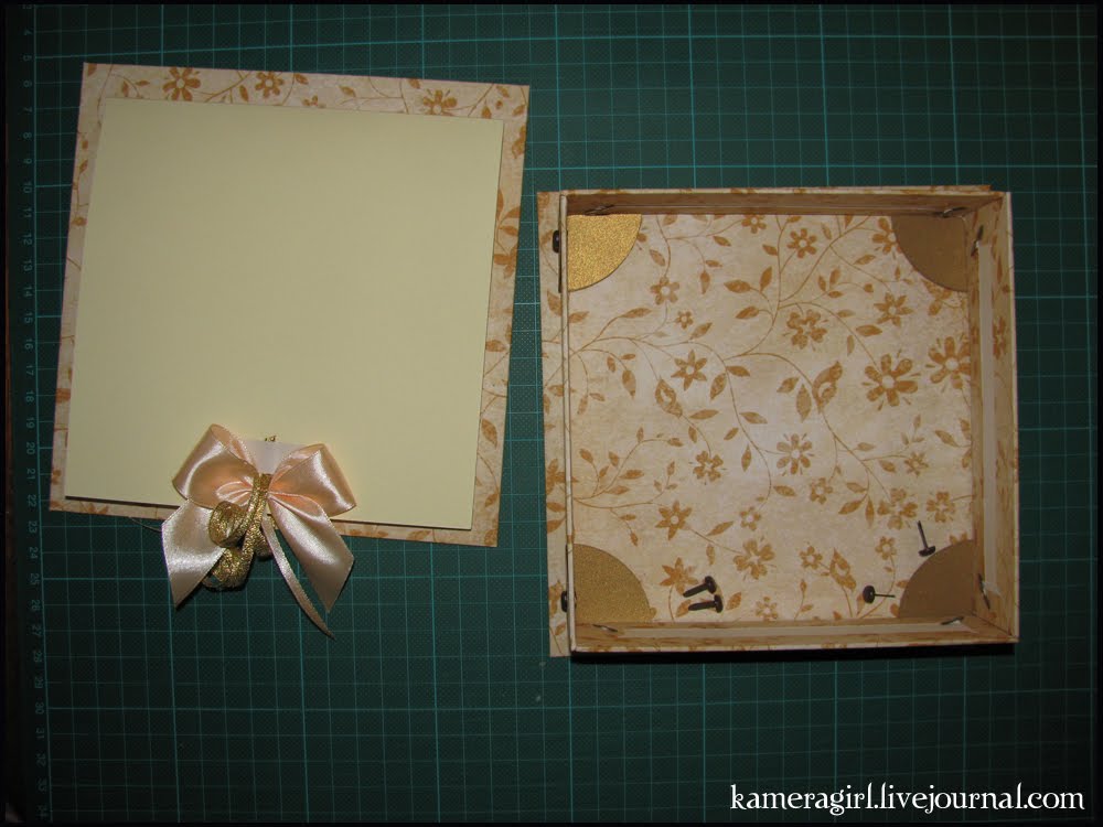 Крышку крепим тоже на брадсы, сначала прикладываем каркас коробки к внутренней стороне крышки, а потом прокалываем шилом отверстия посередине ленточных полосок и продеваем брадсы. Я на брадсы, для красоты, надела цветочки.