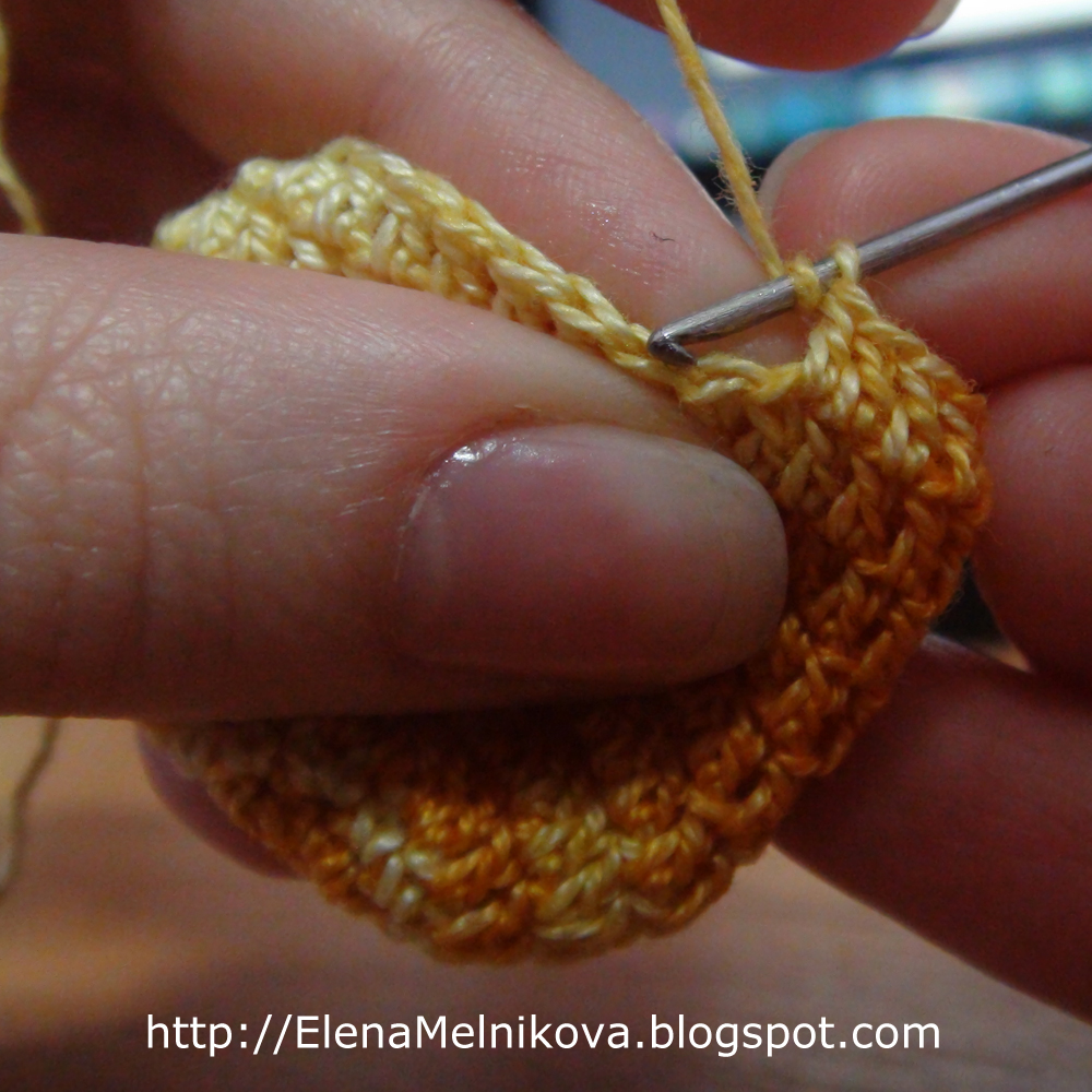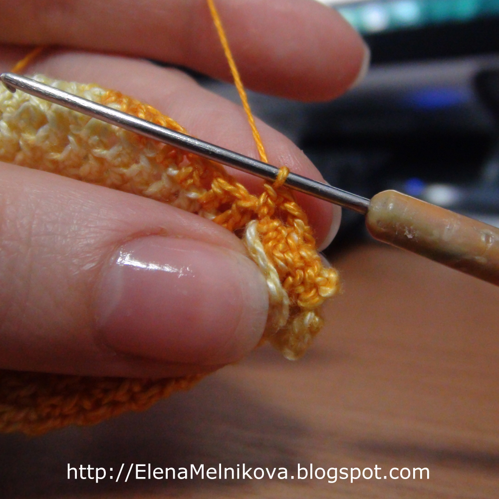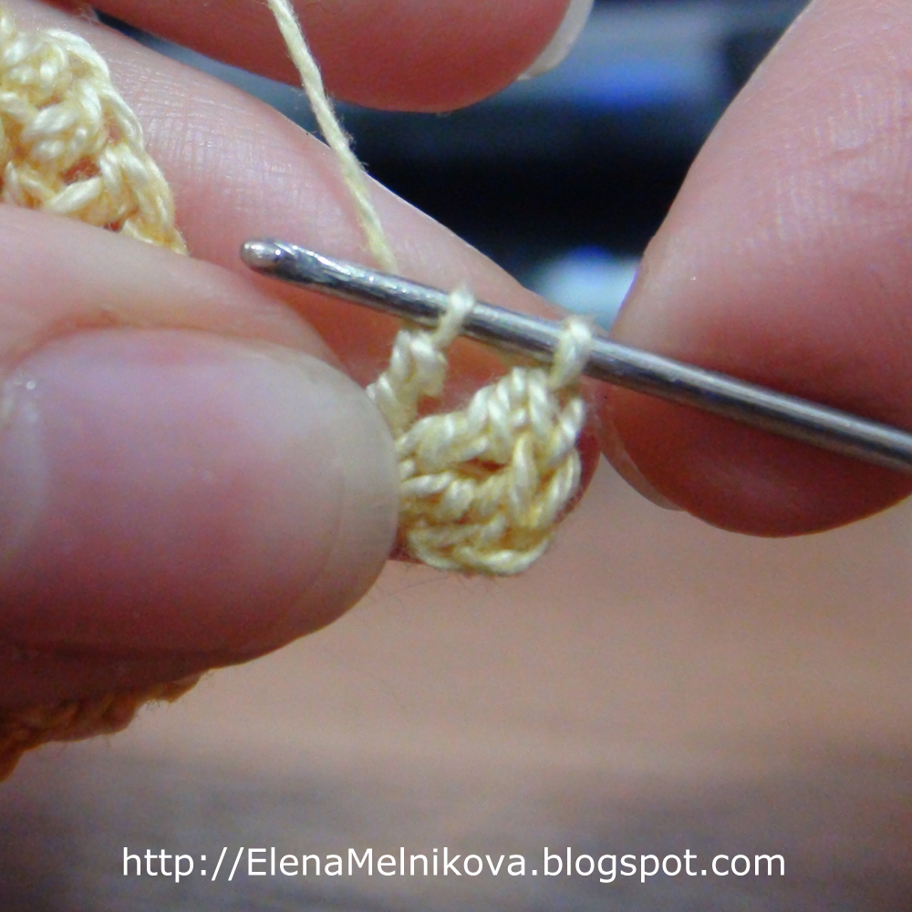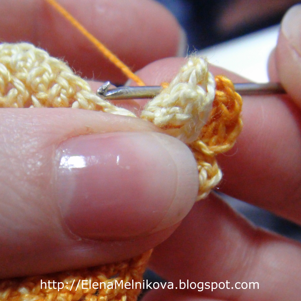 Вяжем еще ряд. В месте цветка нам нужно провязать 3 ст.с н. Но в видимости у нас только два, а центральный скрыт под лепестком. Поэтому вяжем первый ст.с н.
